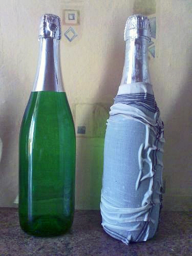 É necessário limpar a garrafa das etiquetas, desengordurar e lubrificar adequadamente com cola branca. Para ela, tecido de algodão perfeito em branco. Enrole a garrafa em um pano e distribua as dobras.