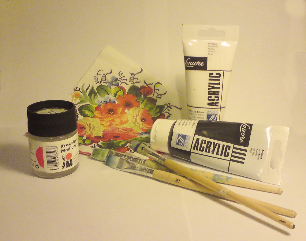 - Tinta acrílica branca. Também pode ser comprado no departamento de materiais de construção. Será muito mais barato que o acrílico profissional para decoupage.