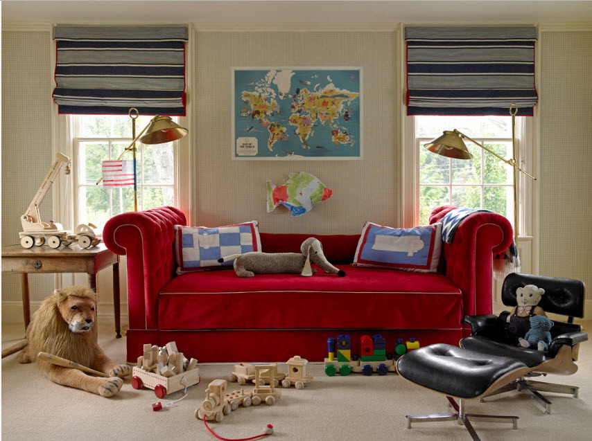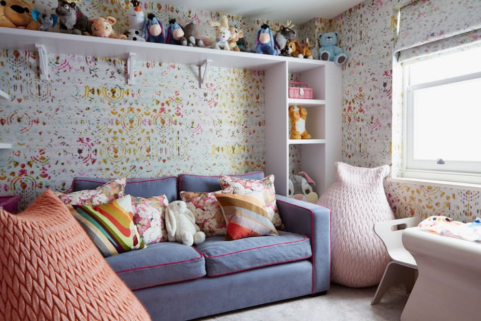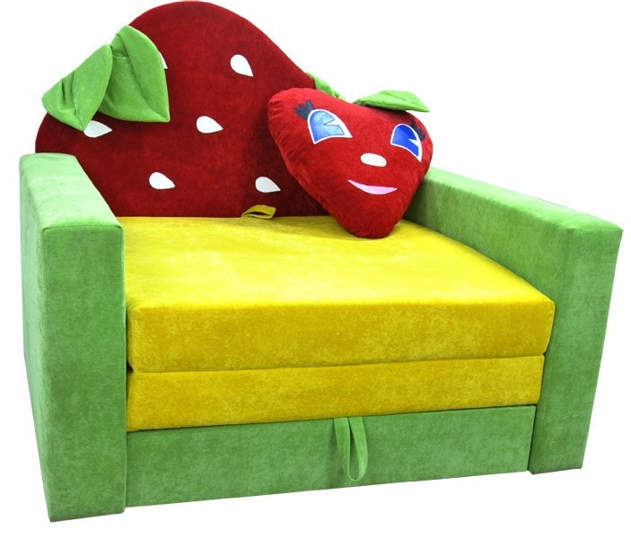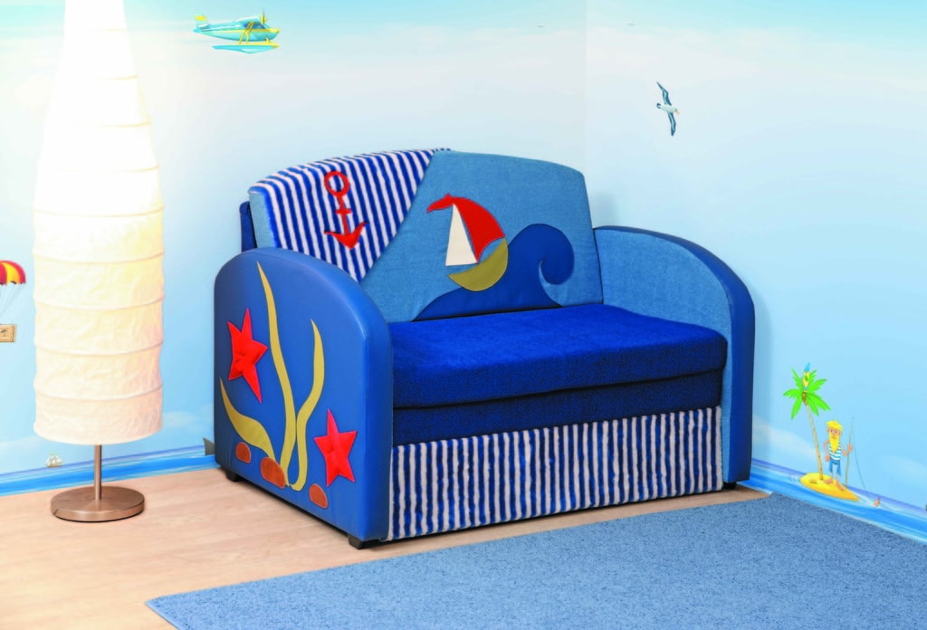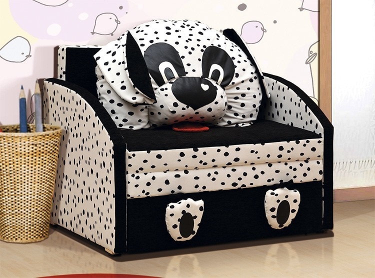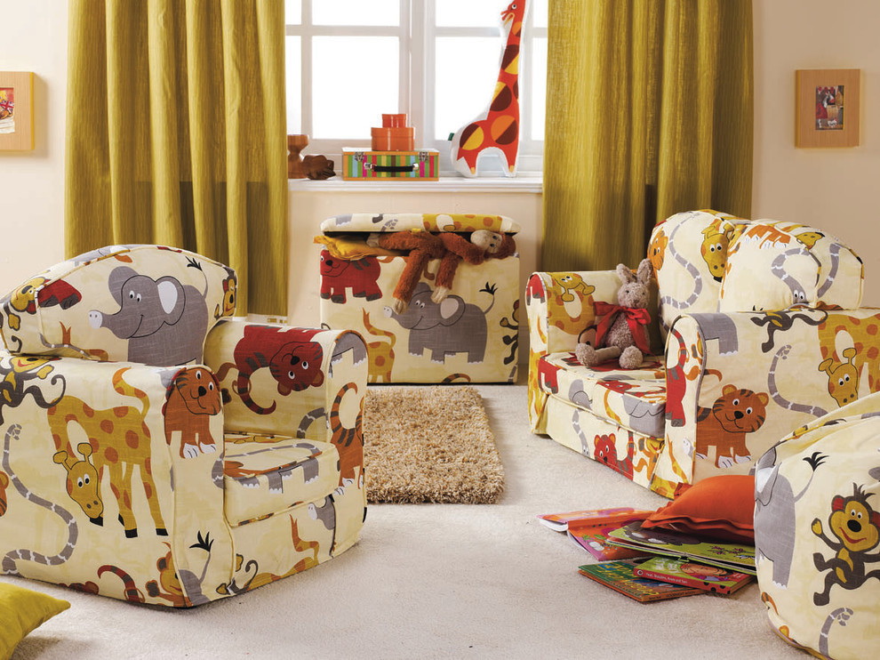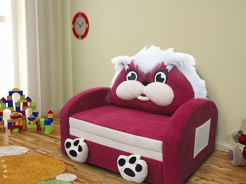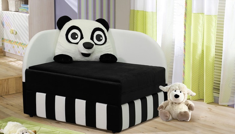 - Sofá estampado. A opção é sempre relevante - e sua principal vantagem é que quando a criança cresce, será possível simplesmente mudar o estofamento para um mais relaxado e adulto. Nesse meio tempo, um sofá com Pokémon, oi monstro e outros personagens populares se encaixam no interior do quarto das crianças. O principal é primeiro certificar-se de que a criança os ama especificamente.