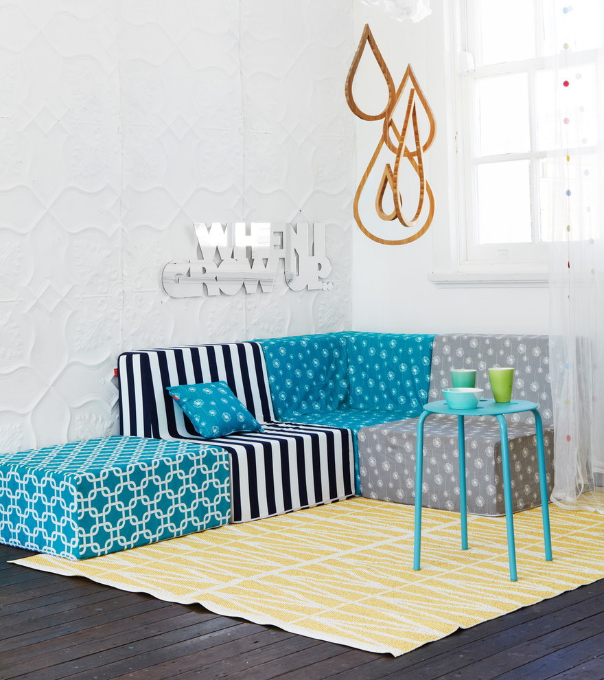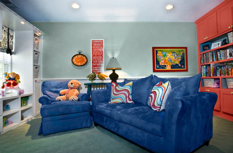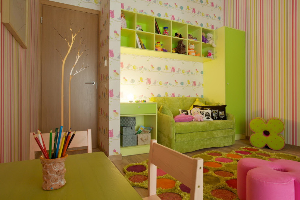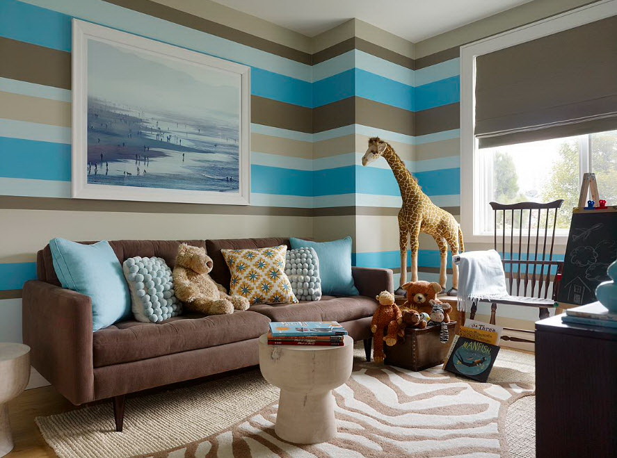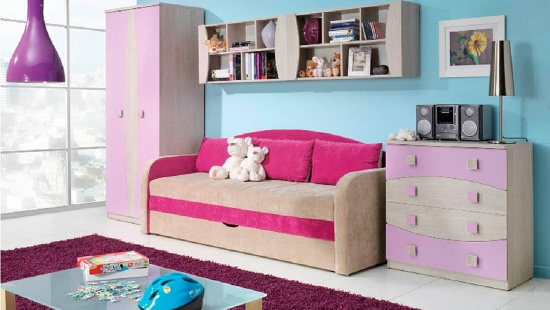 - Sofá liso. As cores brilhantes que encantam pré-escolares não são mais relevantes. Claro, sofá estofado cinzento ou marrom - ainda é uma má idéia, mas você pode preferir cores pastel, tons delicados verde e azul. Dependendo de qual combinação ficará bem com o resto da sala.
