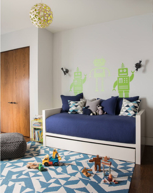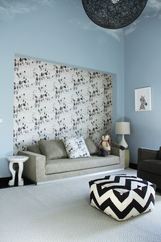 - Azul. Tons de azul também são uma excelente solução para quartos, também pacifica e se ajusta para acalmar. Você pode escolher qualquer opção - da mais clara até a mais escura, quase preta. Fique bem em padrões azuis na forma de nuvens ou peixes.