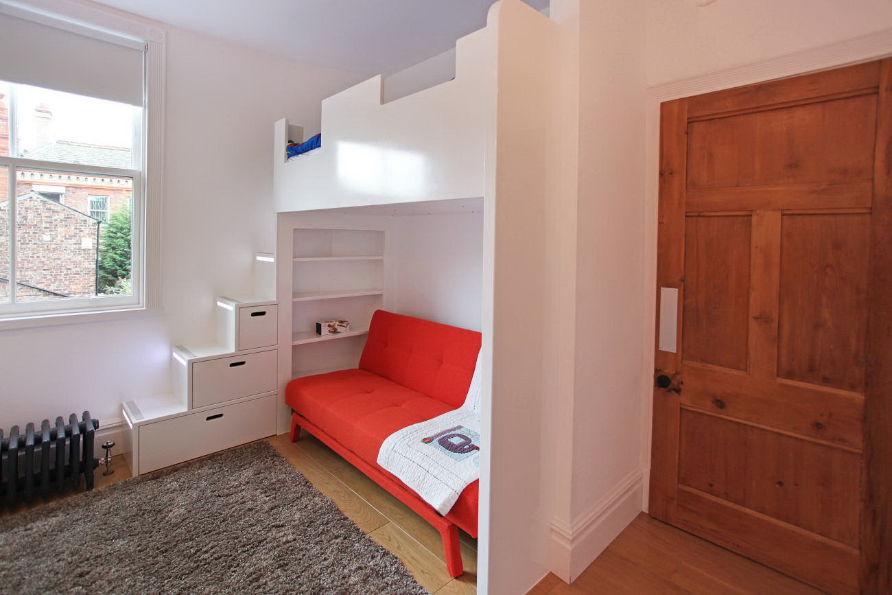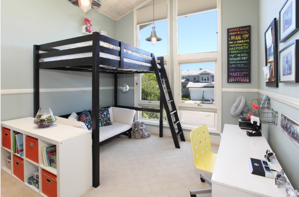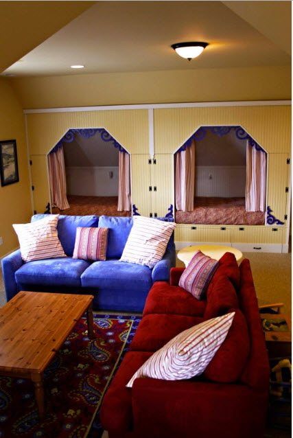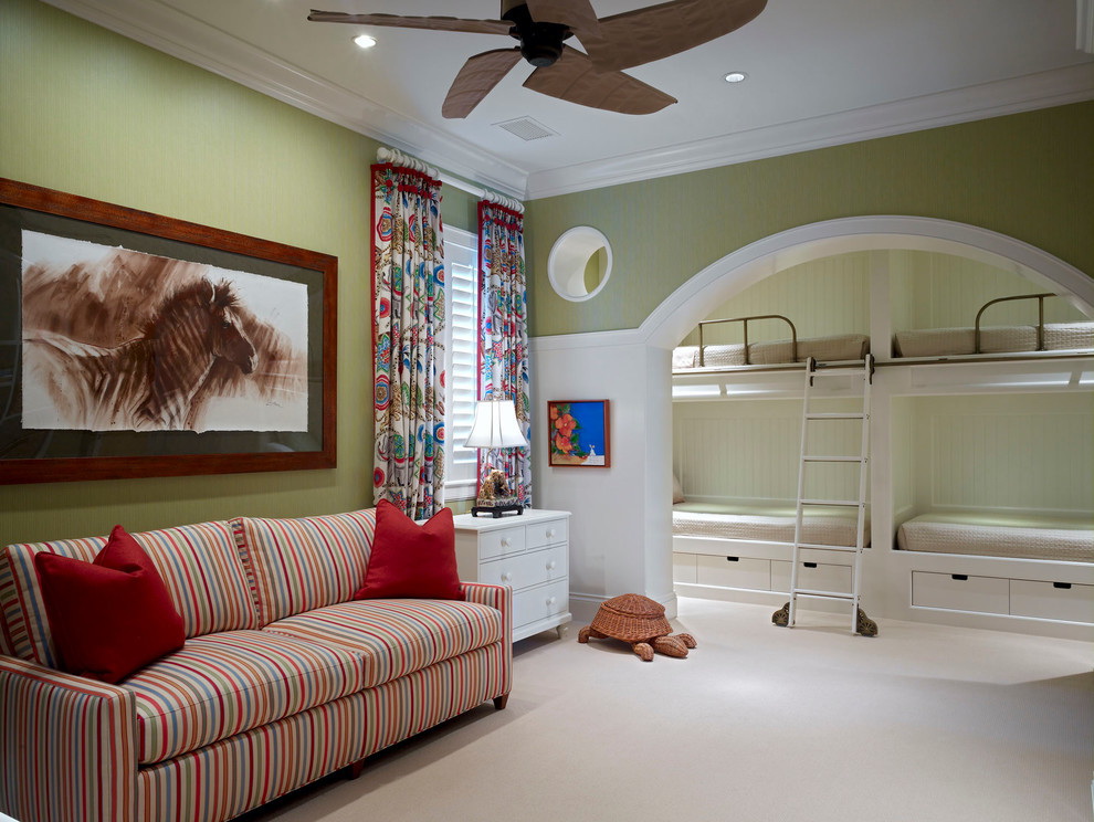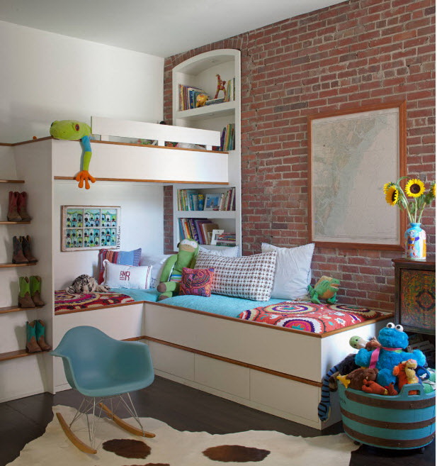 - Sofá e beliche. Esta é uma ótima solução para um pequeno viveiro, onde moram duas crianças da mesma idade ou da mesma idade. Na parte da tarde, o sofá servirá como um lugar onde você pode tomar chá e assistir TV, fazer uma barraca de um cobertor ou brincar juntos em jogos de tabuleiro silenciosos. Pode ser transformado em fortaleza ou apenas tirar uma soneca depois de um dia duro na escola. Mas ao cair da noite, você pode virar o sofá para que o encosto se levante e fique a um metro acima do assento. Uma pequena escada é anexada à construção. De manhã, será possível enrolar a cama, colocá-la em uma gaveta embaixo da parte de baixo e, em seguida, enrolar as camas em um sofá.