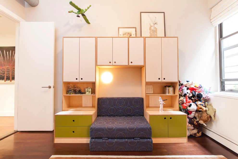 - Sofá e guarda-roupa. A solução para o berçário, em que simplesmente não há espaço para um armário separado. Parece uma parede de armário, no meio da qual há um sofá preso a ela. Em volta de gavetas, acima dele - prateleiras. À noite, quando ninguém precisa de um lugar no chão, o sofá se desdobra e a criança pode ir para a cama. Na parte da tarde, a roupa de cama é removida em uma das caixas.