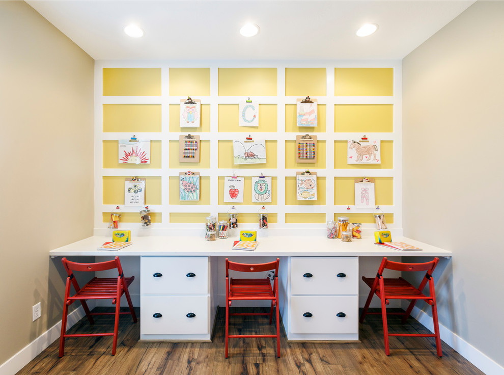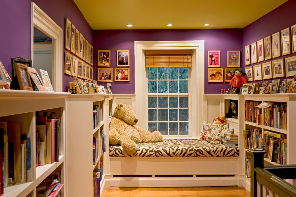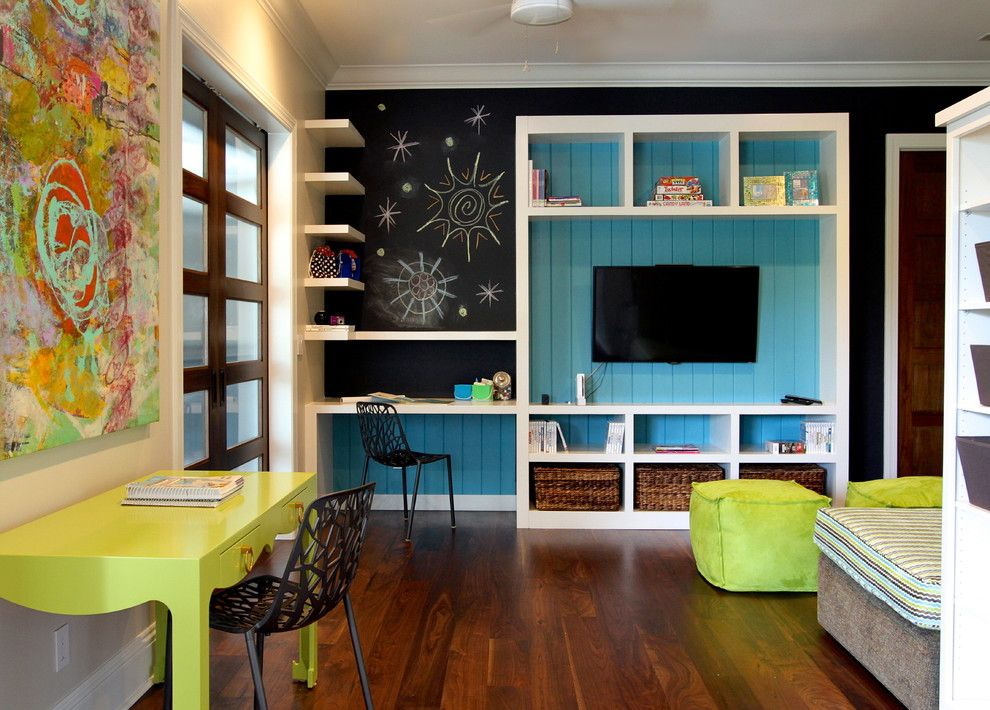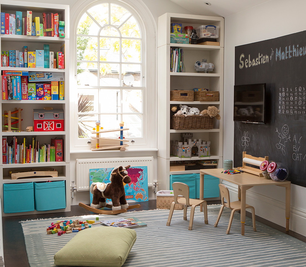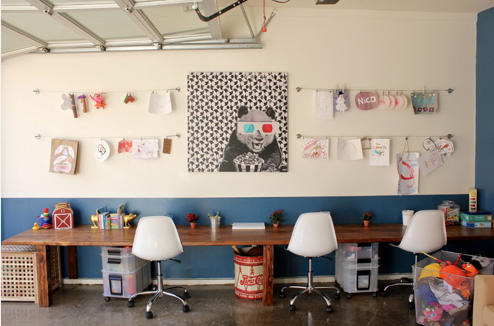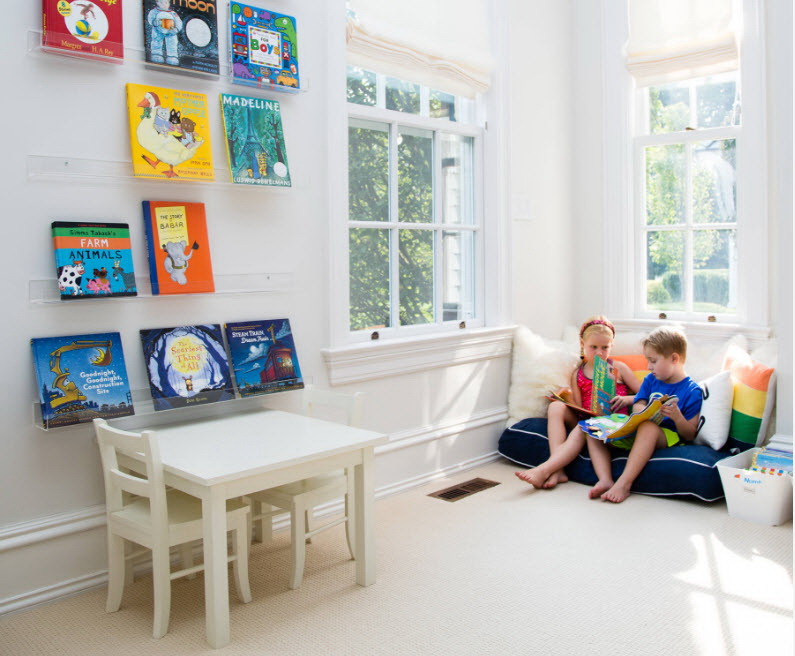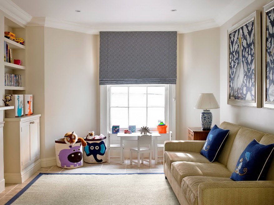 A área de jogo na sala de crianças em idade escolar pode receber menos atenção ou eliminá-la completamente. Você pode desenhar, fazer modelagem ou outros hobbies na mesa, e o espaço extra tornará a sala mais livre e adequada para jogos ativos.