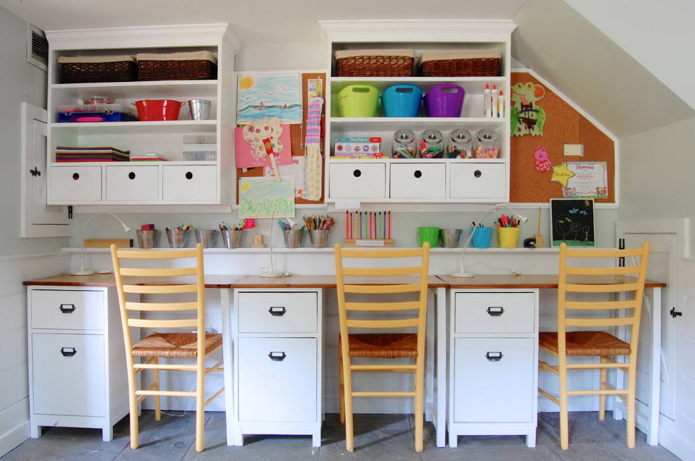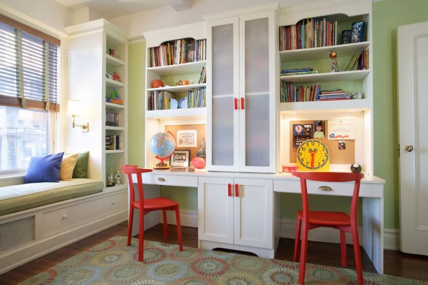Área de guarda-roupa é melhor para combinar, destacando um grande armário para crianças. Mas armários ou prateleiras para material escolar fazem cada um individualmente. Pode ser prateleiras deslizantes na mesa, armários estreitos de seção única, prateleiras ou prateleiras montadas na parede.