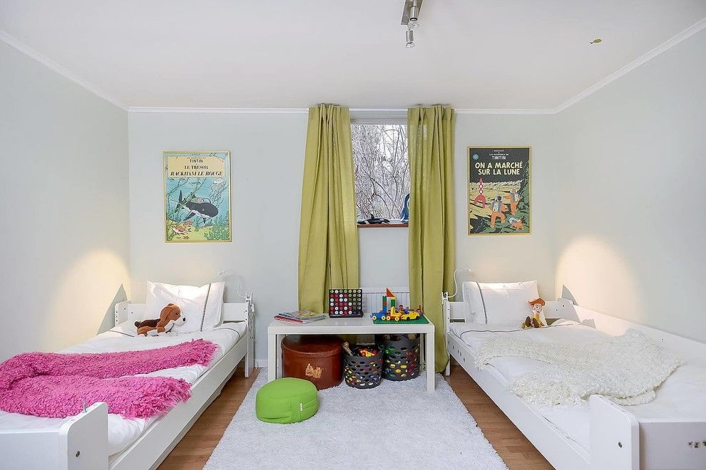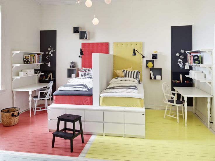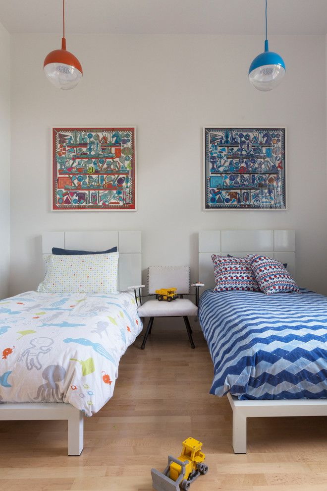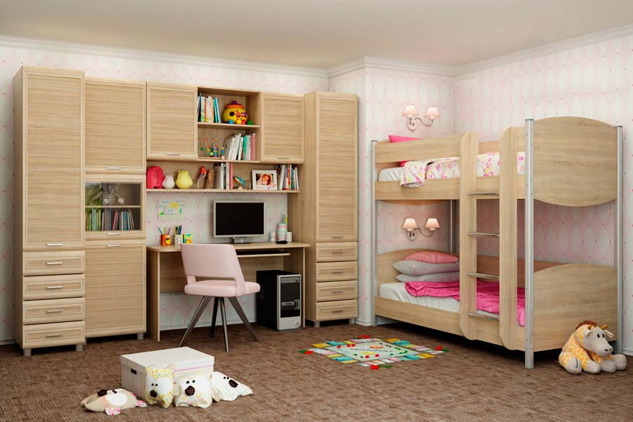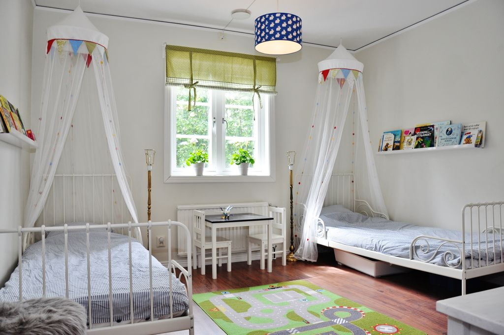 A área de dormir também pode ser combinada. Denotar a cama cada criança com elementos adicionais, para evitar conflitos, para prestar atenção a ambos. Esta pode ser uma roupa de cama diferente, cor ou forma da cama.