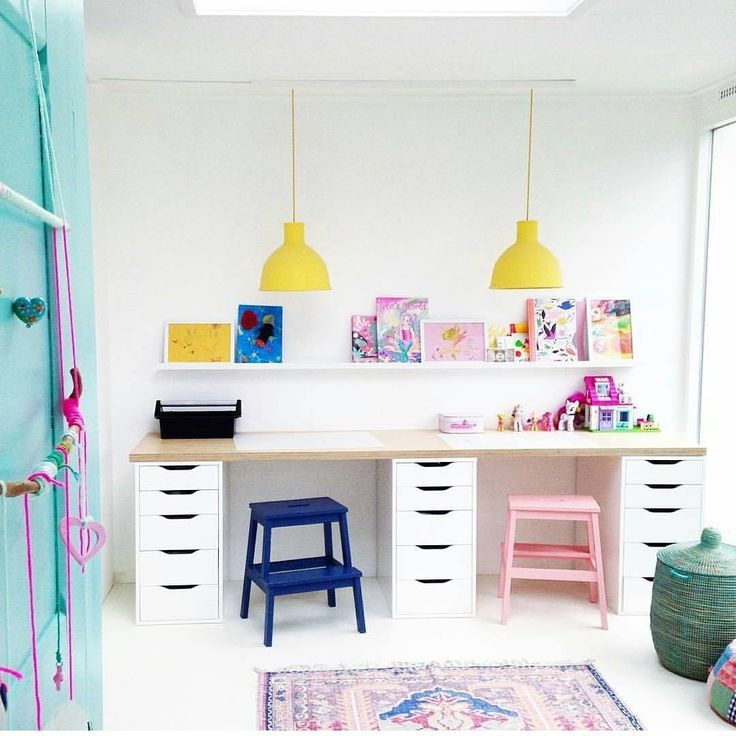 Para que as crianças não se distraiam durante os estudos, colocamos cada mesa separadamente, à distância. Se não houver essa possibilidade, escolhemos tabelas com um separador de partição. Como a necessidade de uma zona de jogo é quase eliminada, as tabelas podem ser colocadas pela janela.