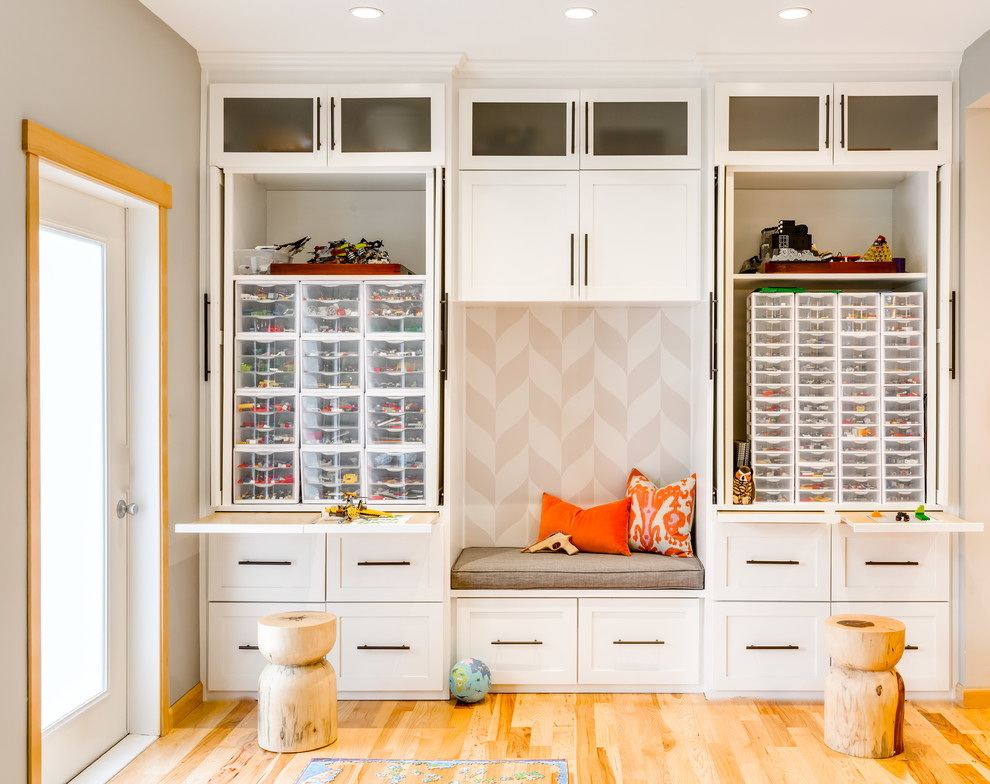 Em seguida, as áreas de jogo ou de trabalho estão localizadas na janela e os gabinetes estão localizados ao longo da parede livre ou nos cantos da sala.
