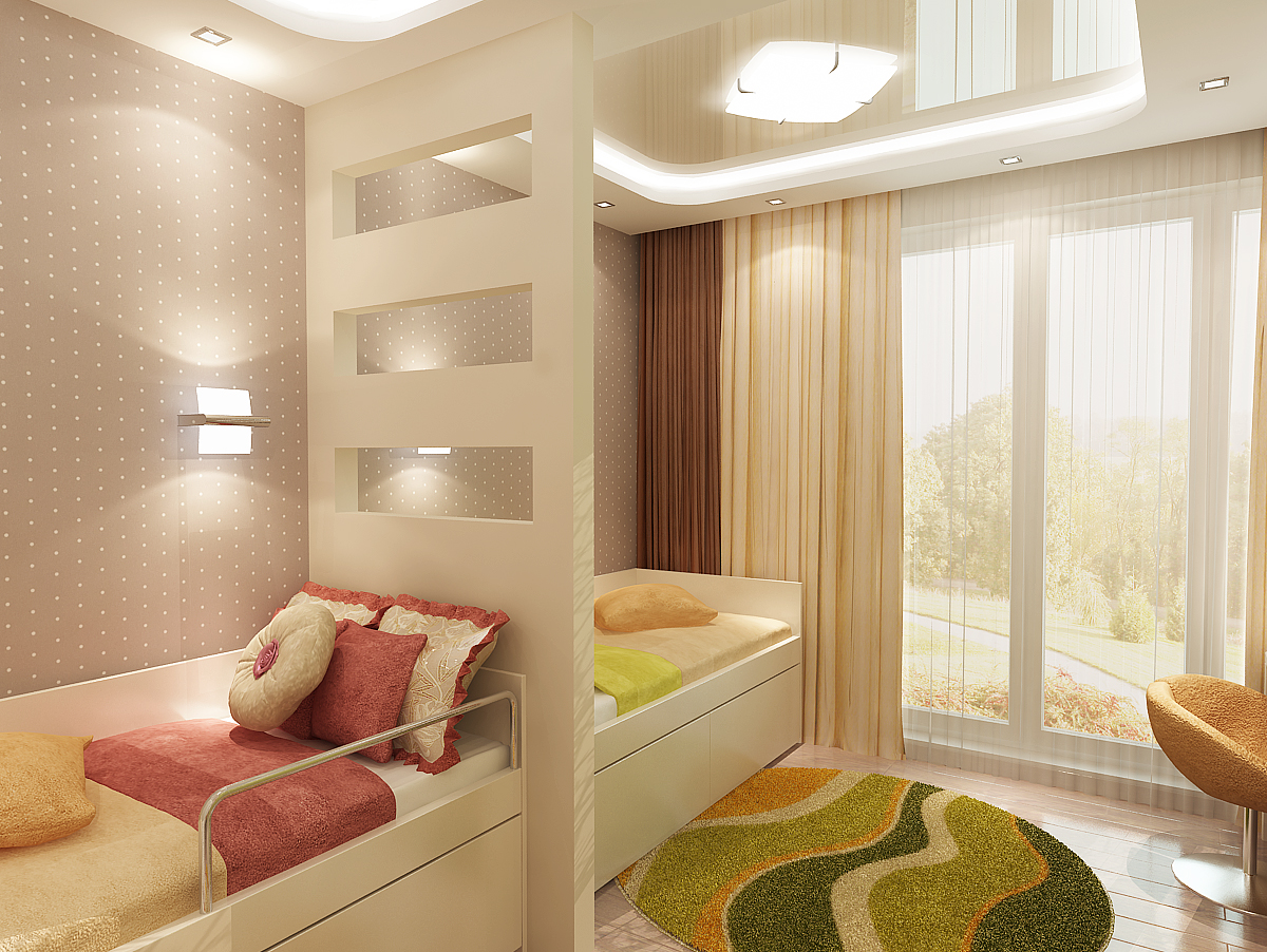 As camas também podem ser organizadas em uma fileira ao longo da parede, e entre elas, organizar uma pequena partição ou comprar uma cama com uma partição ready-made na cabeceira da cama. Por via de regra, tais partições normalmente têm uma forma arredondada.