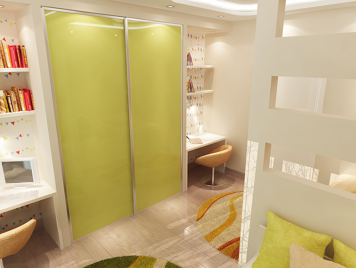 Escolha gabinetes com espelhos em uma ou mais portas. Assim, você não precisa alocar espaço adicional para espelhos, antes da qual as crianças se reunirão, e a sala aumentará visualmente.