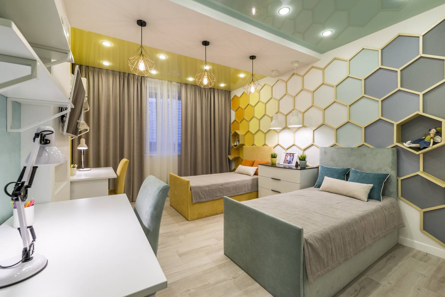 - Planejamos o interior para que o quarto seja condicionalmente dividido em uma área de dormir, brincar, trabalhar, vestir-se.