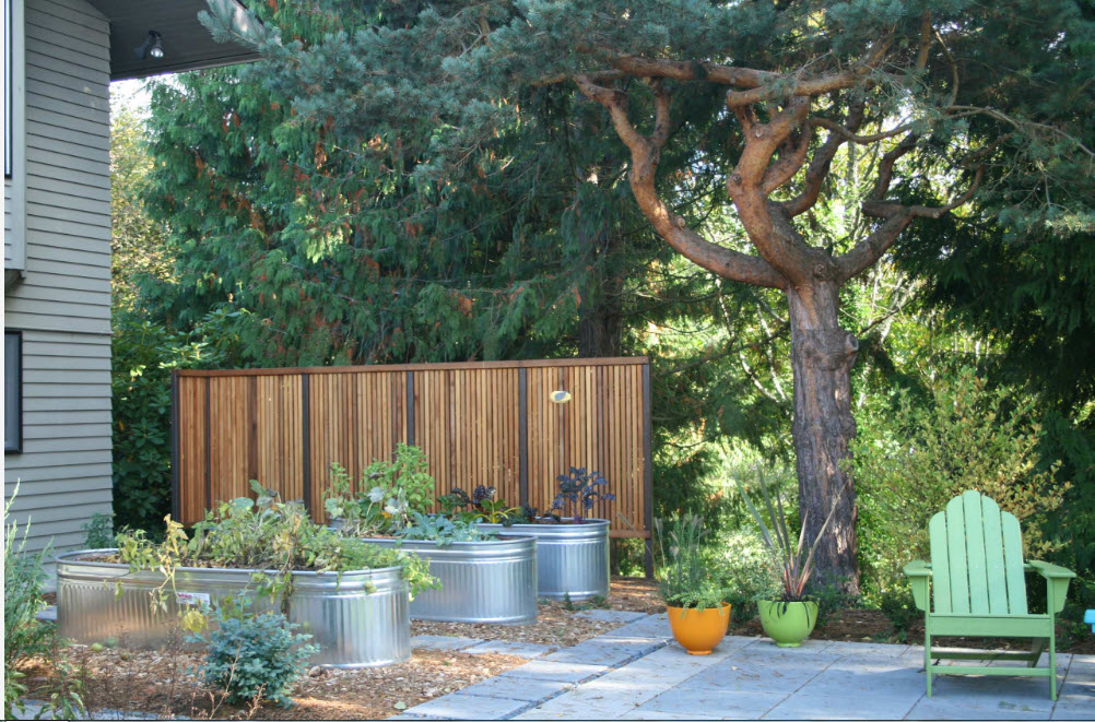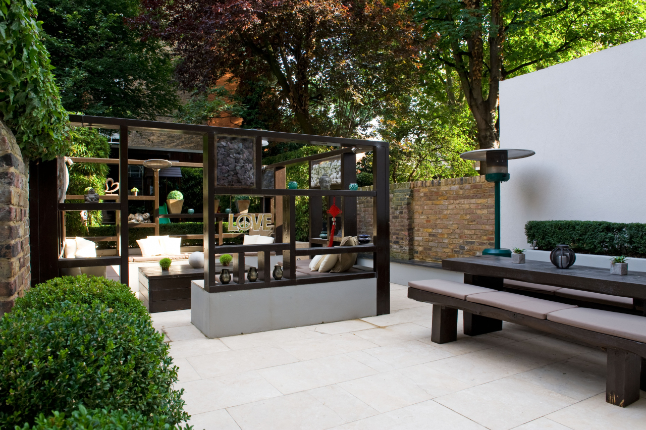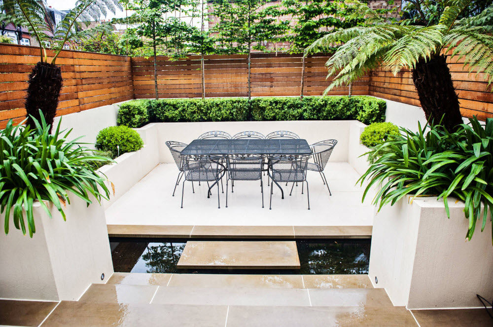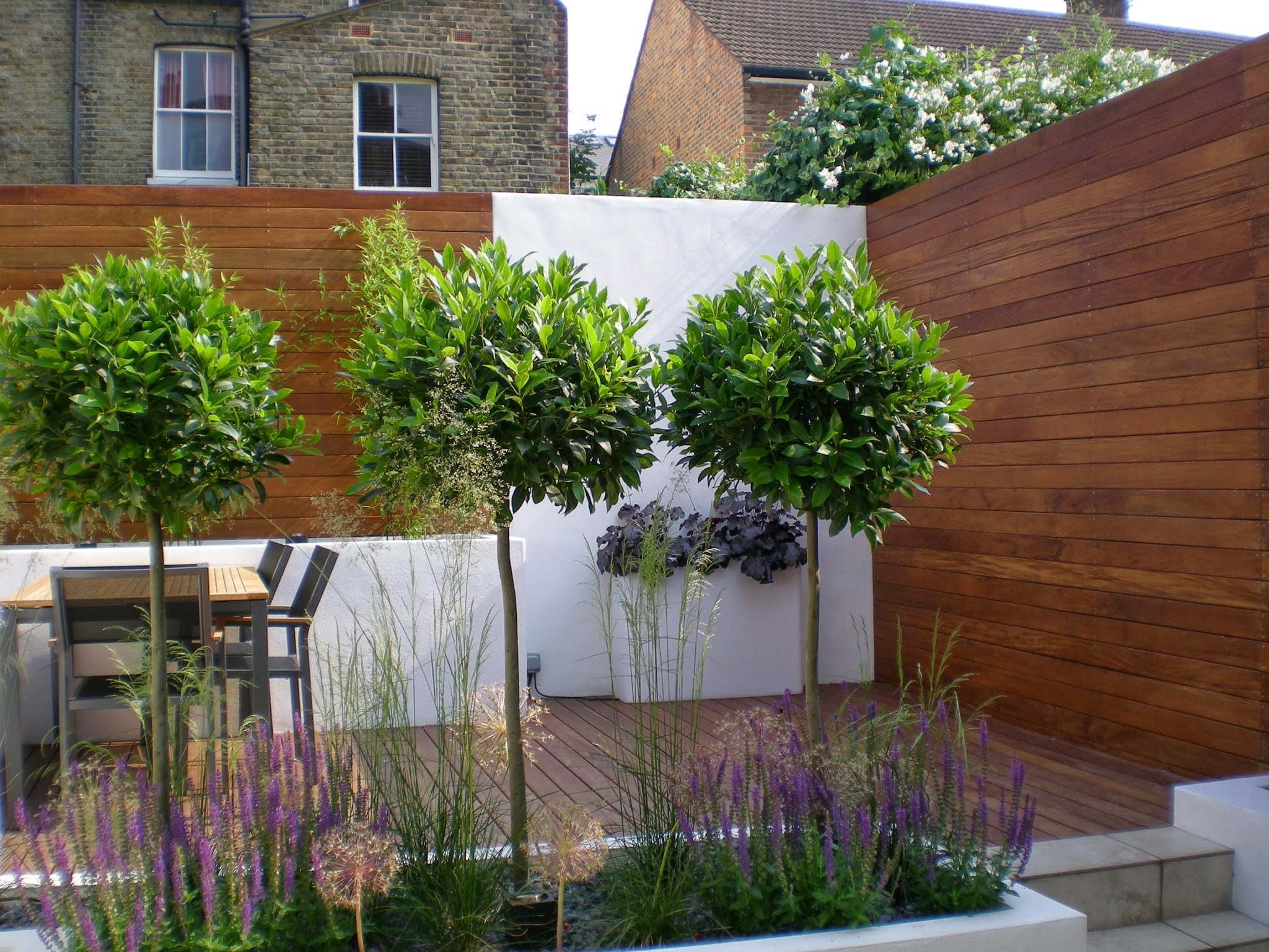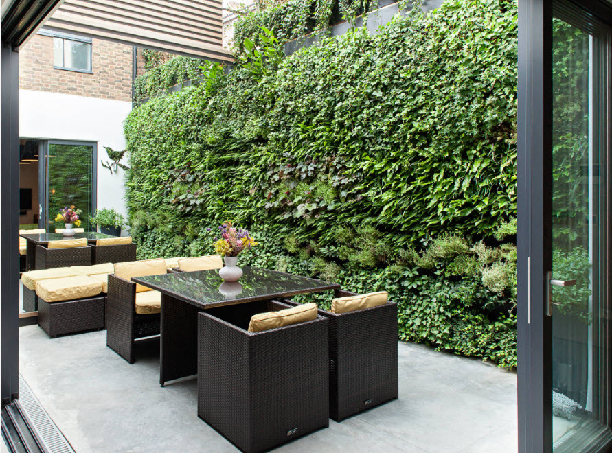 O pátio merece atenção. É importante que seja fechado, opaco. Criar um espaço inacessível para olhares indiscretos, você pode com a ajuda de árvores e arbustos altos densamente plantados.