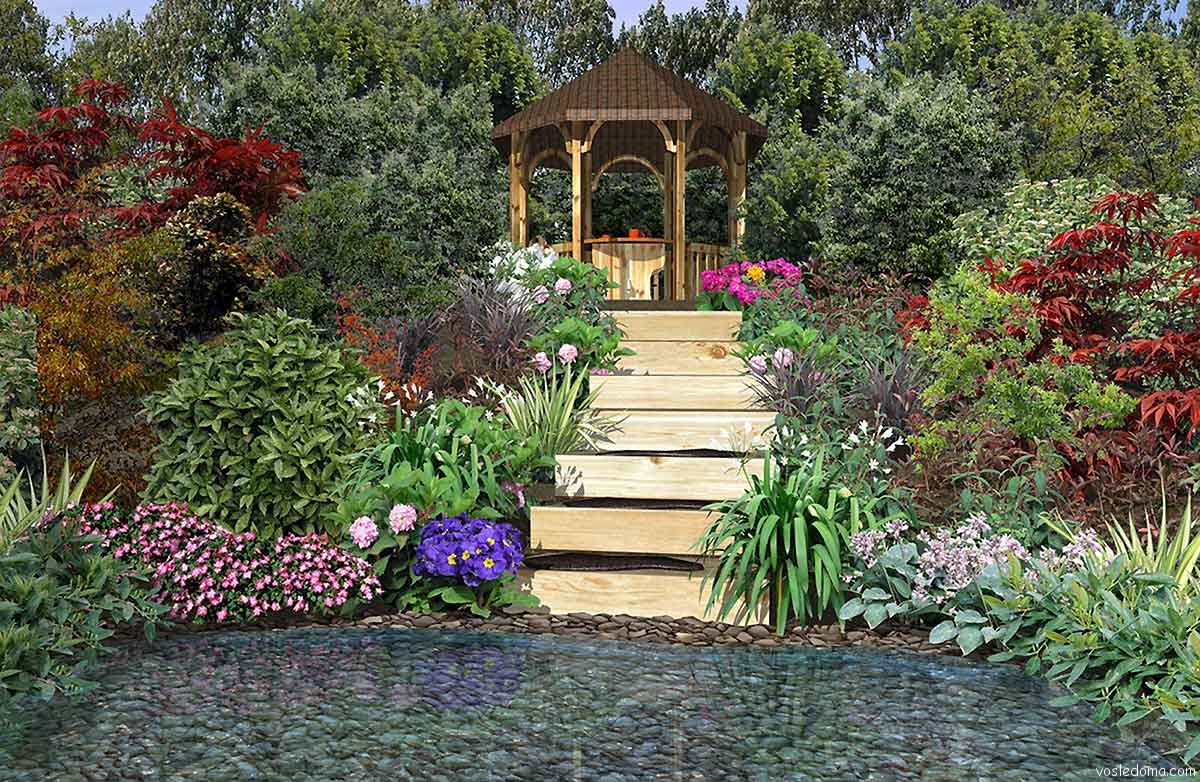 Plantas um pouco, no entanto, eles precisam escolher com cuidado e colocá-lo com cuidado. Se falamos de árvores, é melhor escolher proprietários de coroa não-padrão ou uma cor única de folhas. Quanto às flores, lírio branco, phlox, malva vermelha, rosas, narcisos e peônias são bem-vindos.