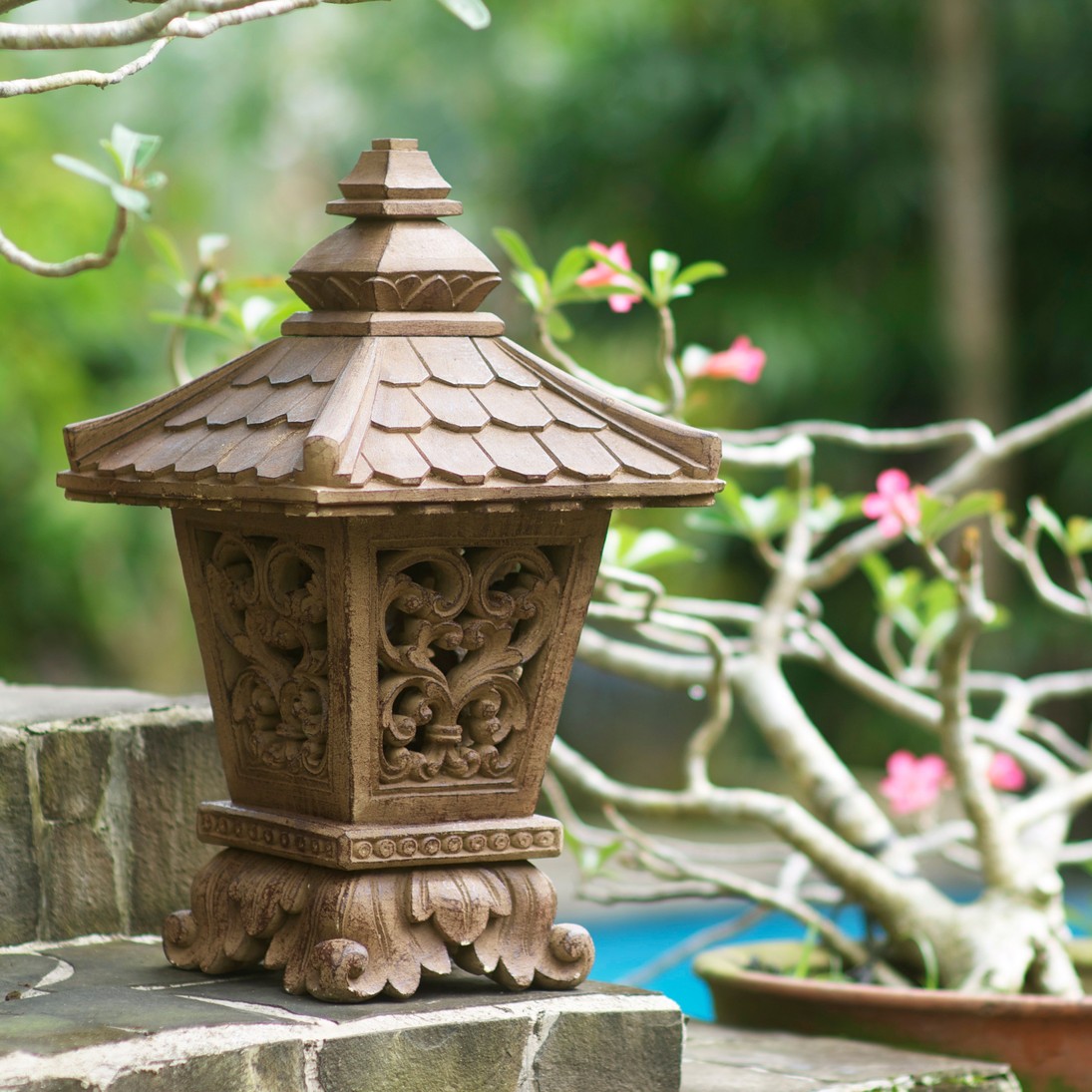 A iluminação desempenha um papel importante: prestando atenção a ela, você pode apreciar a beleza a qualquer hora do dia. É melhor comprar luzes japonesas especiais, das quais existem muitas variedades.