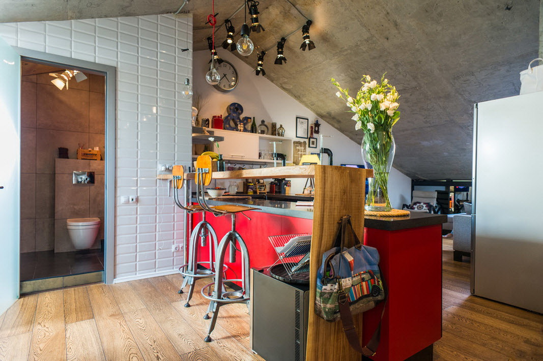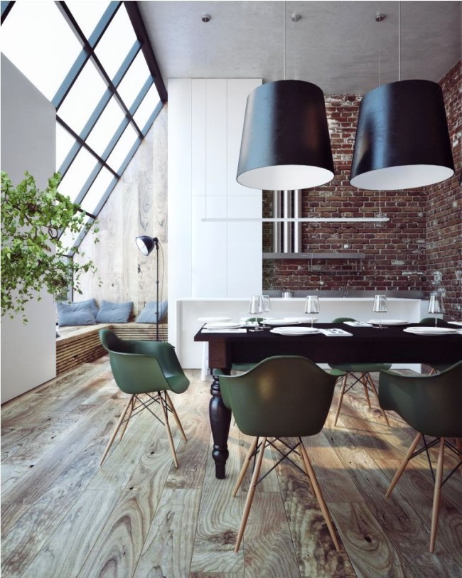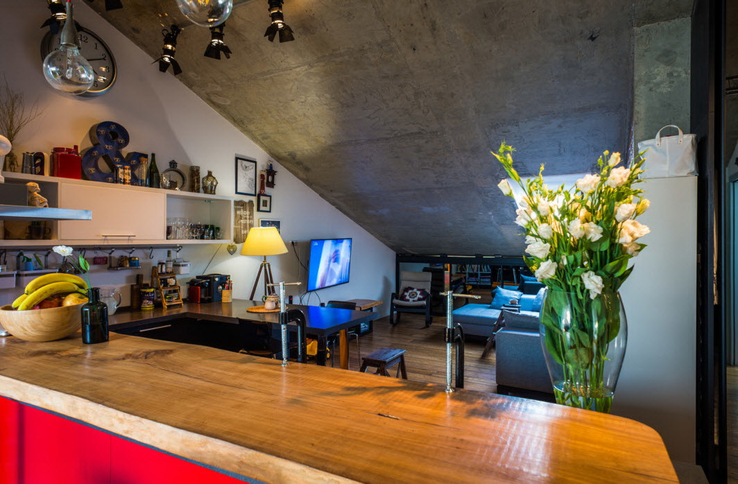 A peculiaridade do interior do sótão é a abundância de luz natural, que permite a utilização de móveis escuros, decoração de paredes com painéis de madeira natural, abundantes acessórios de metal.