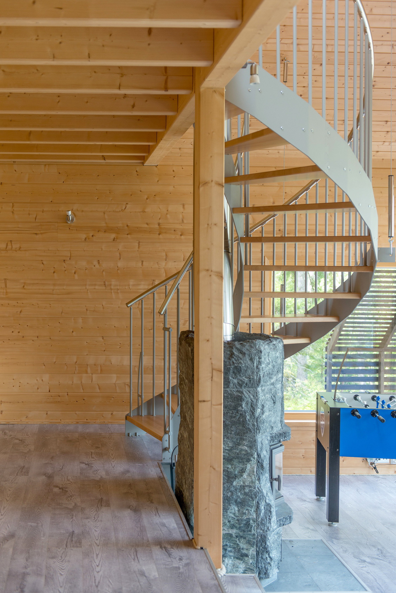 Casas quentes para residência permanente têm banheiros espaçosos, saunas, instalações de hidromassagem. O quarto no andar de cima é adequado para um banho de hóspedes, criando uma pequena área para relaxamento.