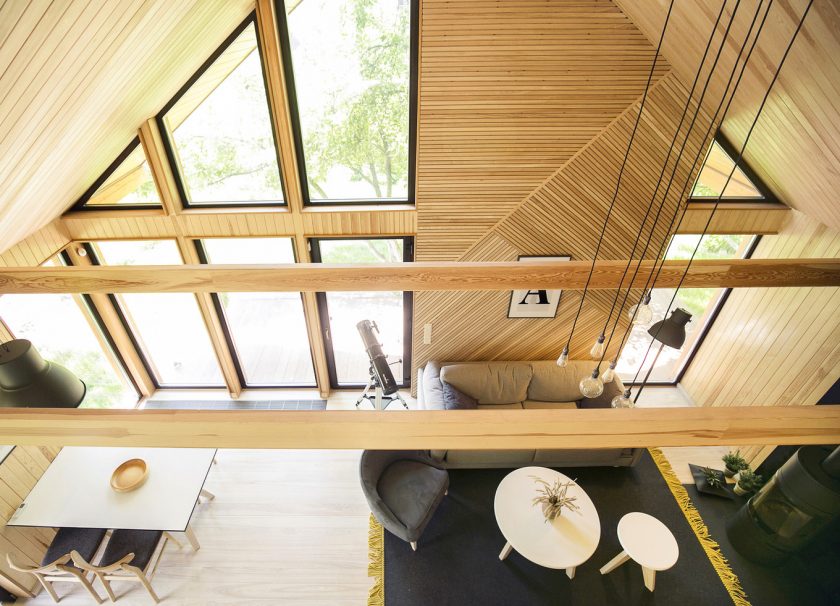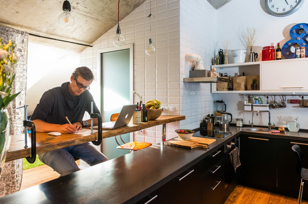Colocar uma área para recreação diária no espaço do sótão permite economizar espaço no primeiro andar. Esta solução é utilizada pelos proprietários de casas em miniatura com uma sala de cozinha combinada: