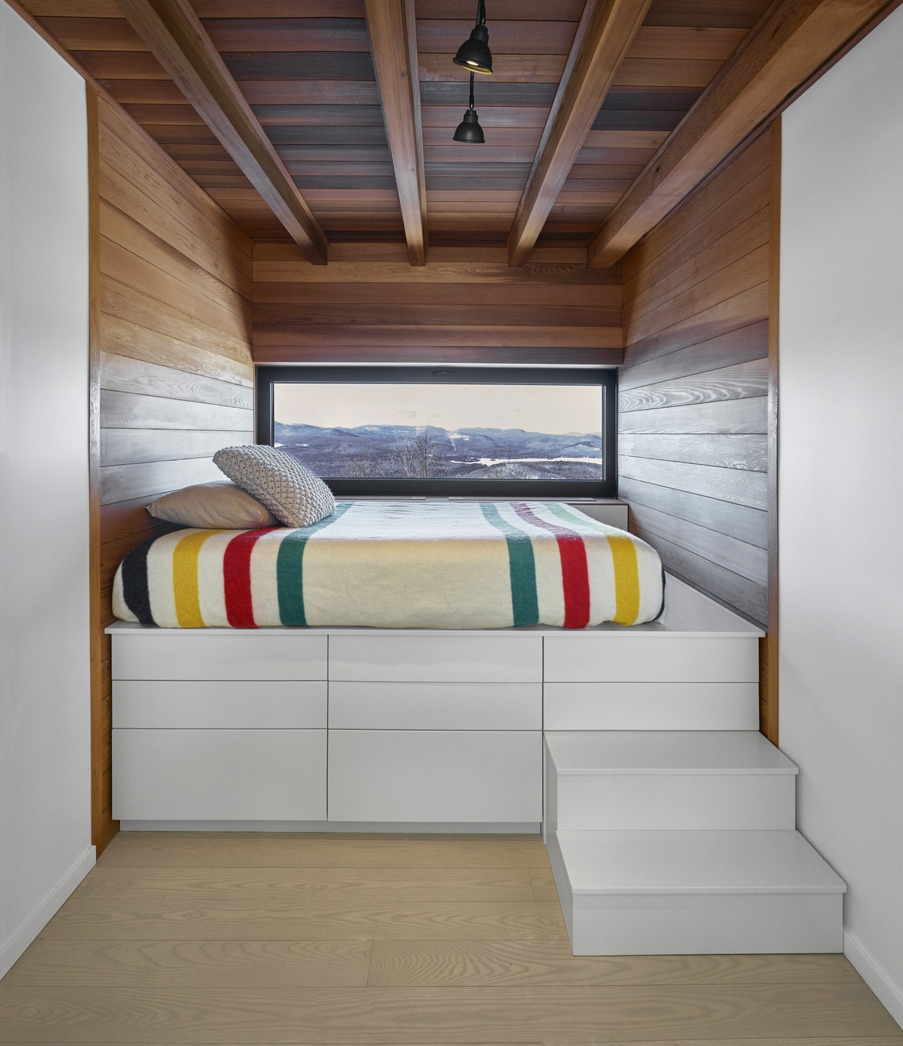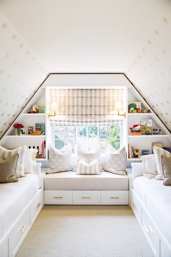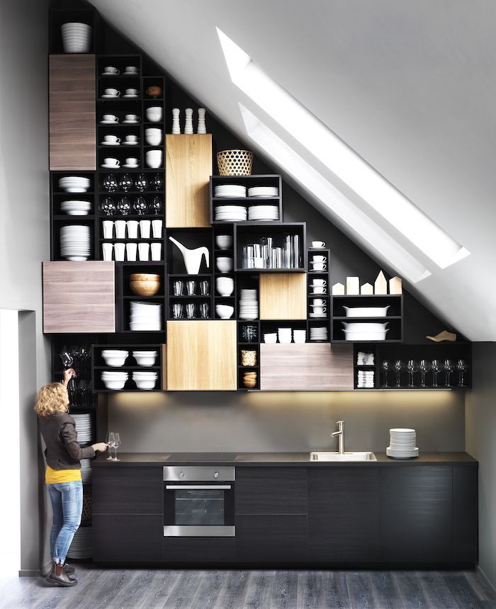Coberturas em miniatura e quartos com pequenas encostas do telhado são usados para criar sistemas de armazenamento embutidos para roupas, equipamentos esportivos e decorações para árvores de Natal. Terminar a sala envolve a instalação de LED lâmpadas, caixas modulares e prateleiras-transformadores.