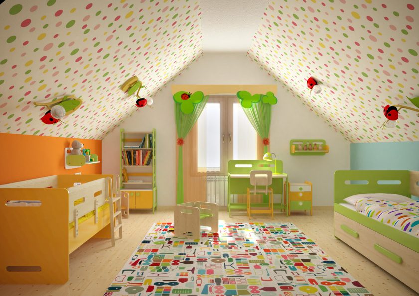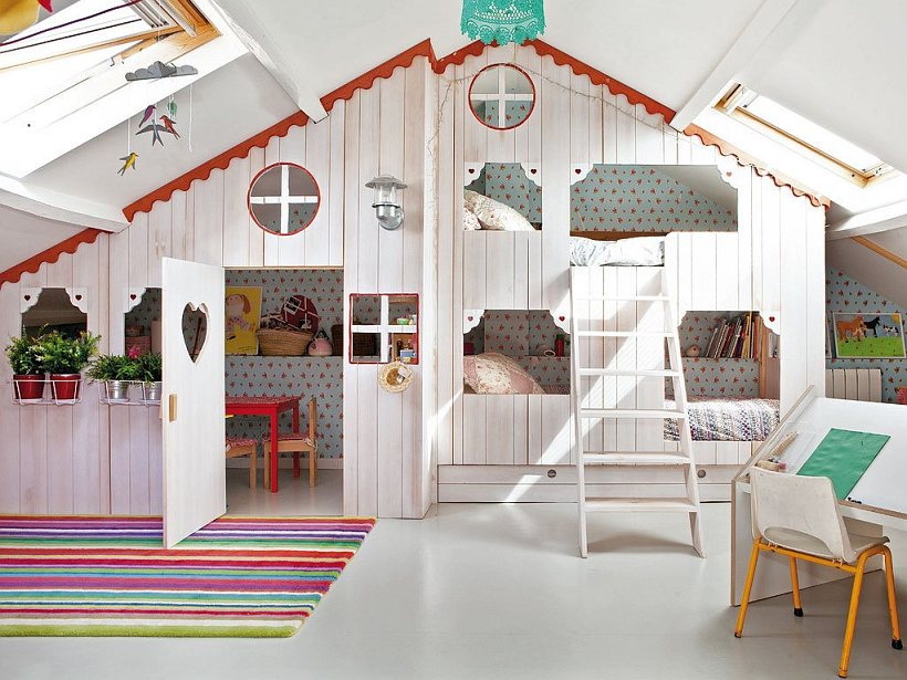 Sótão infantil requer a instalação de um sistema de aquecimento. Escolha janelas grandes para melhor iluminação do ambiente. O estilo interior para crianças é escolhido em cores claras, os materiais usam natural, resistente à poluição. Por exemplo, o acabamento da parede de gesso é conveniente para reparos regulares, hipoalergênico para crianças. A decoração da sala é composta por uma área de trabalho, um local para recreação e espaço de armazenamento.
