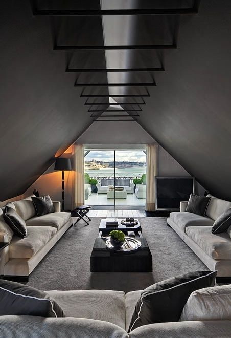 Os proprietários de casas em vários andares com um layout compacto criam uma sala de recreação ou uma sala de estar toda a largura do quarto do sótão. Isso economiza espaço no térreo, a sala é isolada das zonas econômicas comuns. O interior da sala é construído em torno das principais peças de mobiliário.
