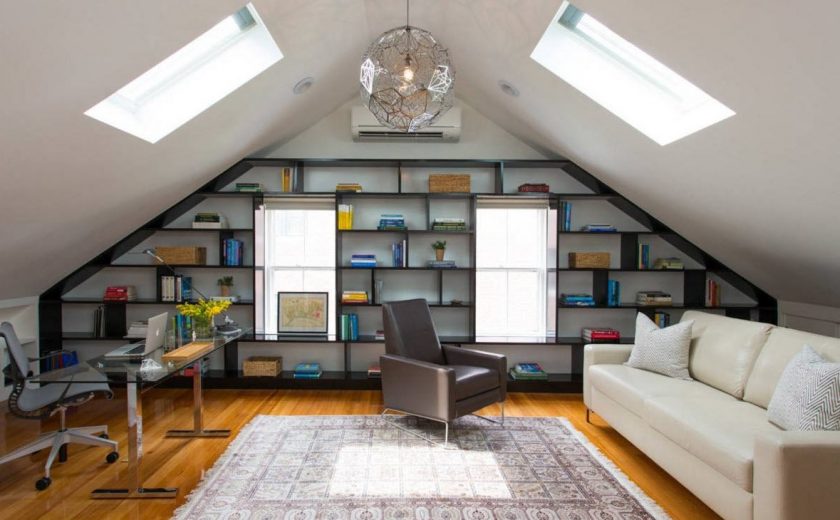 Um espaço mais versátil para recreação, combinado com treinamento - uma biblioteca no sótão. O teto alto e as janelas inclinadas permitem que você organize um quarto sombrio tradicional com prateleiras do chão ao teto. Uma versão mais moderna da biblioteca em estilo escandinavo inclui gesso branco, móveis de madeira clara, tecidos em tons contrastantes.