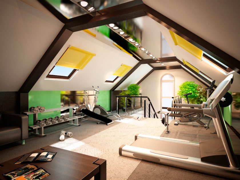 Sótão em miniatura com um pequeno número de janelas são adequados para a criação de um ginásio. O interior depende da direção do emprego: