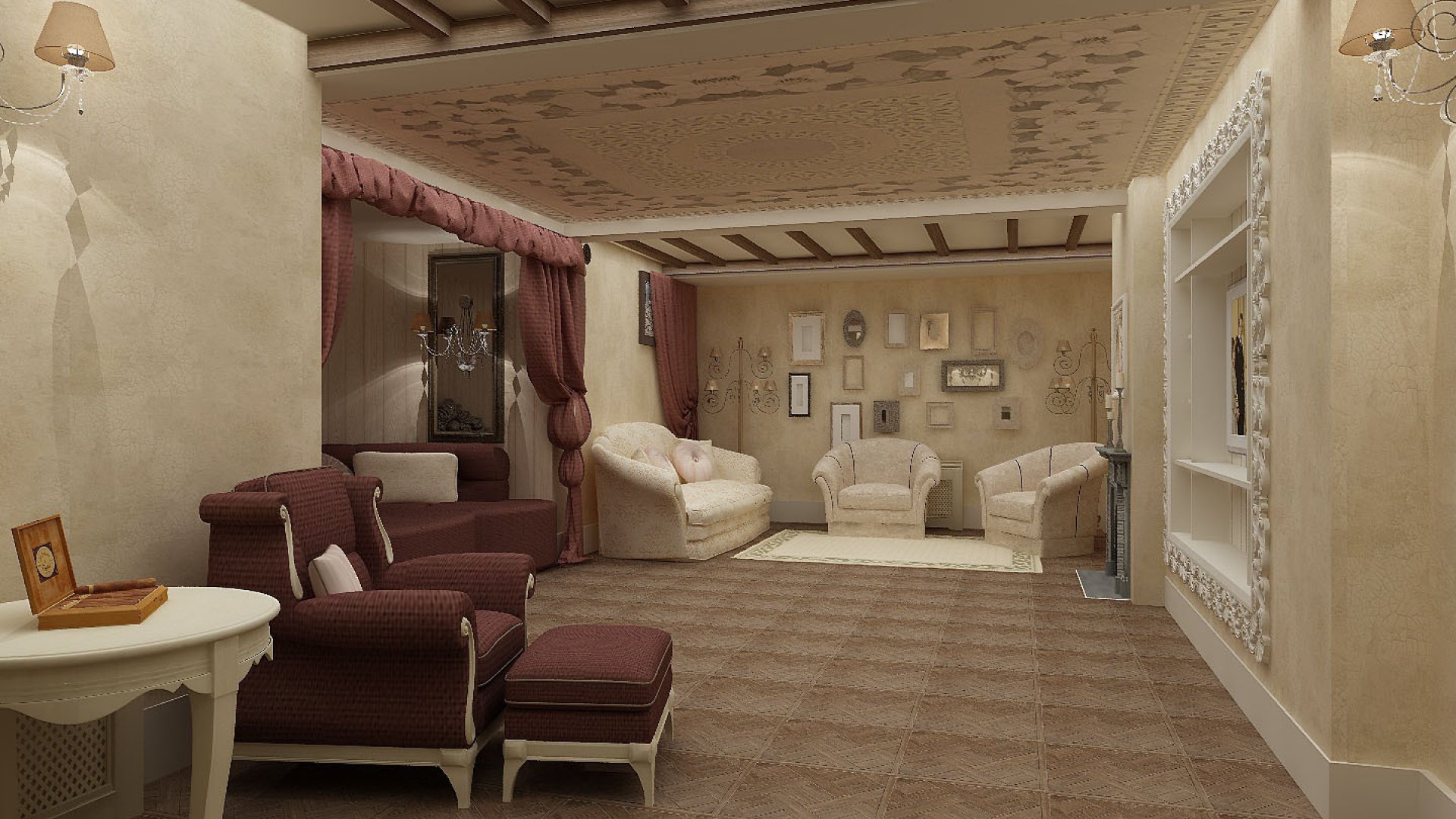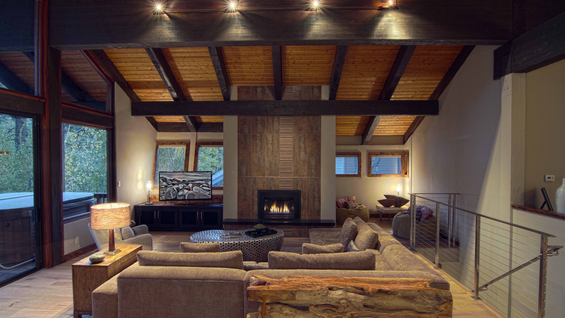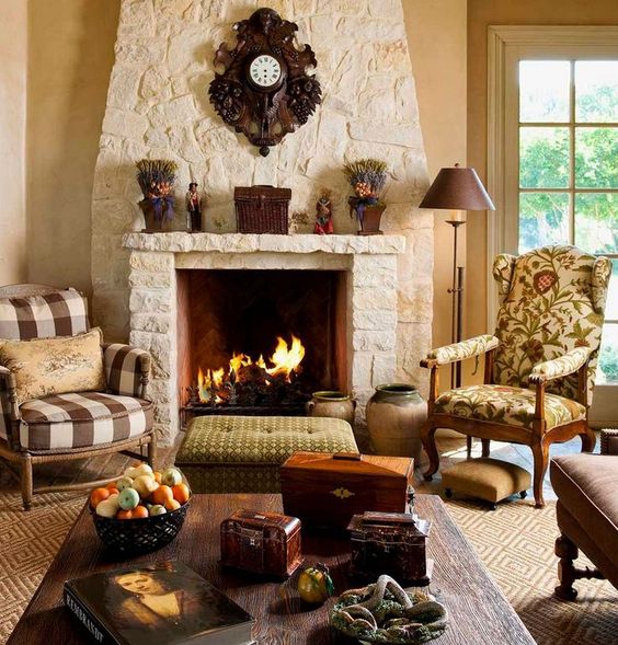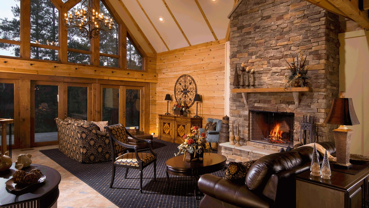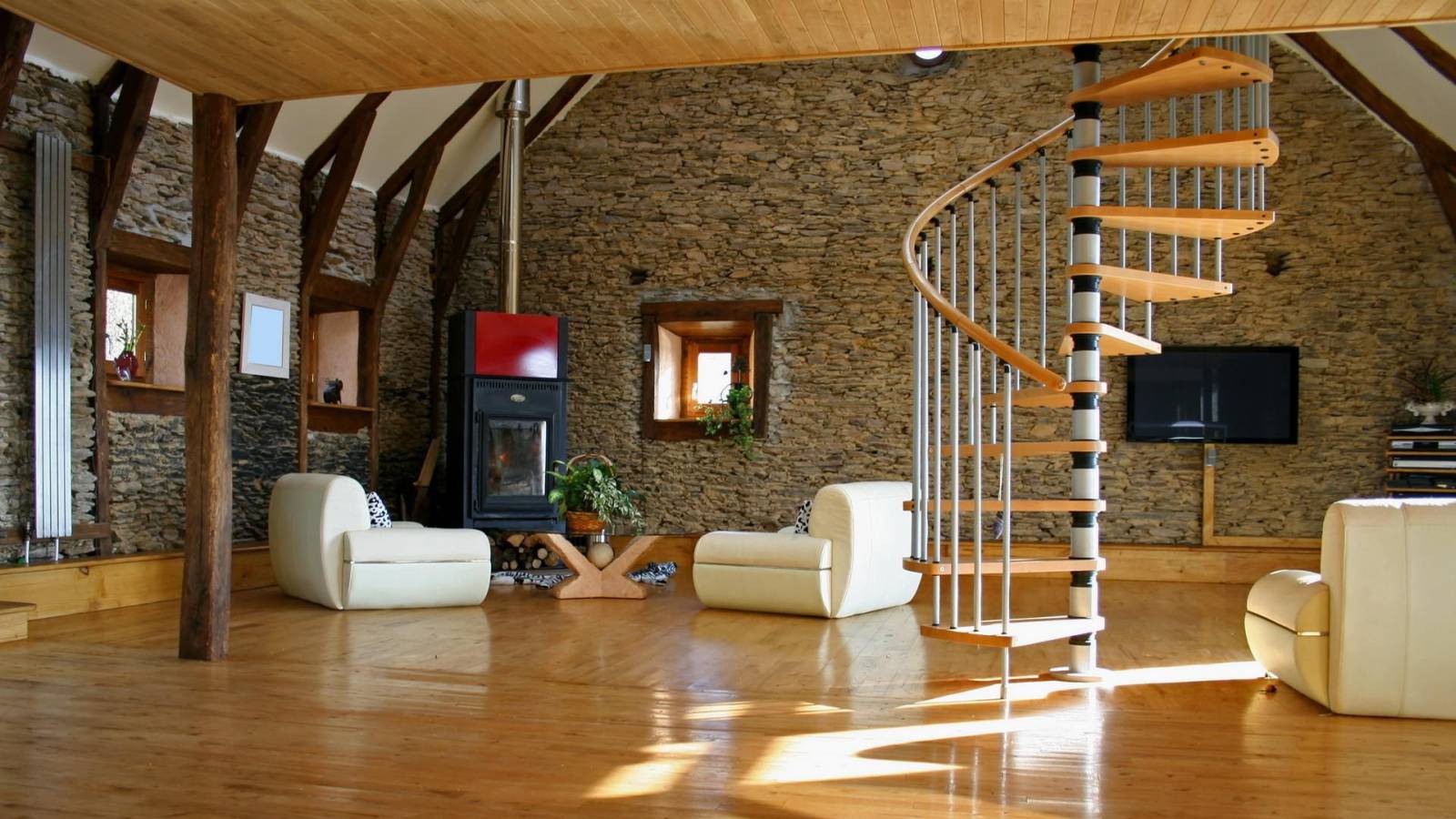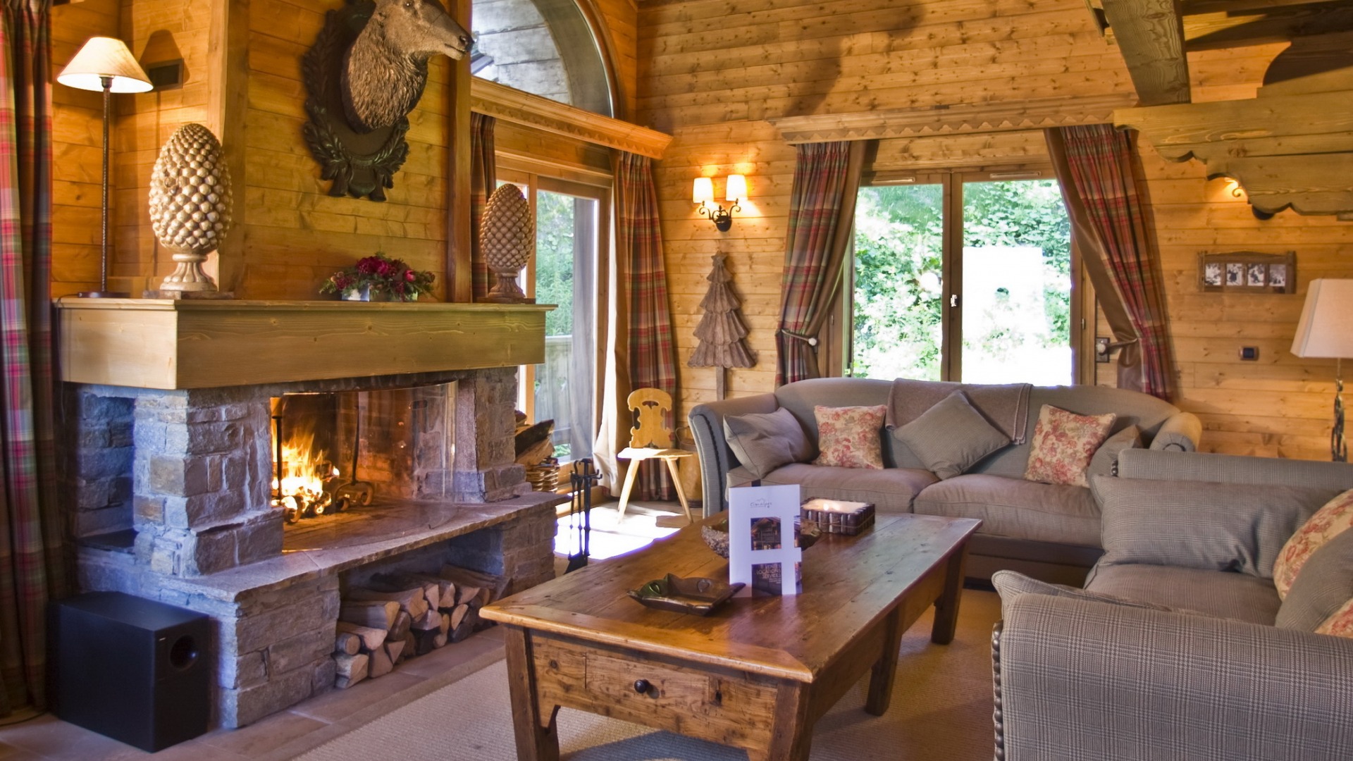 O interior da sala de estar em uma casa de campo é melhor feito a partir de materiais naturais ou imitações de alta qualidade.