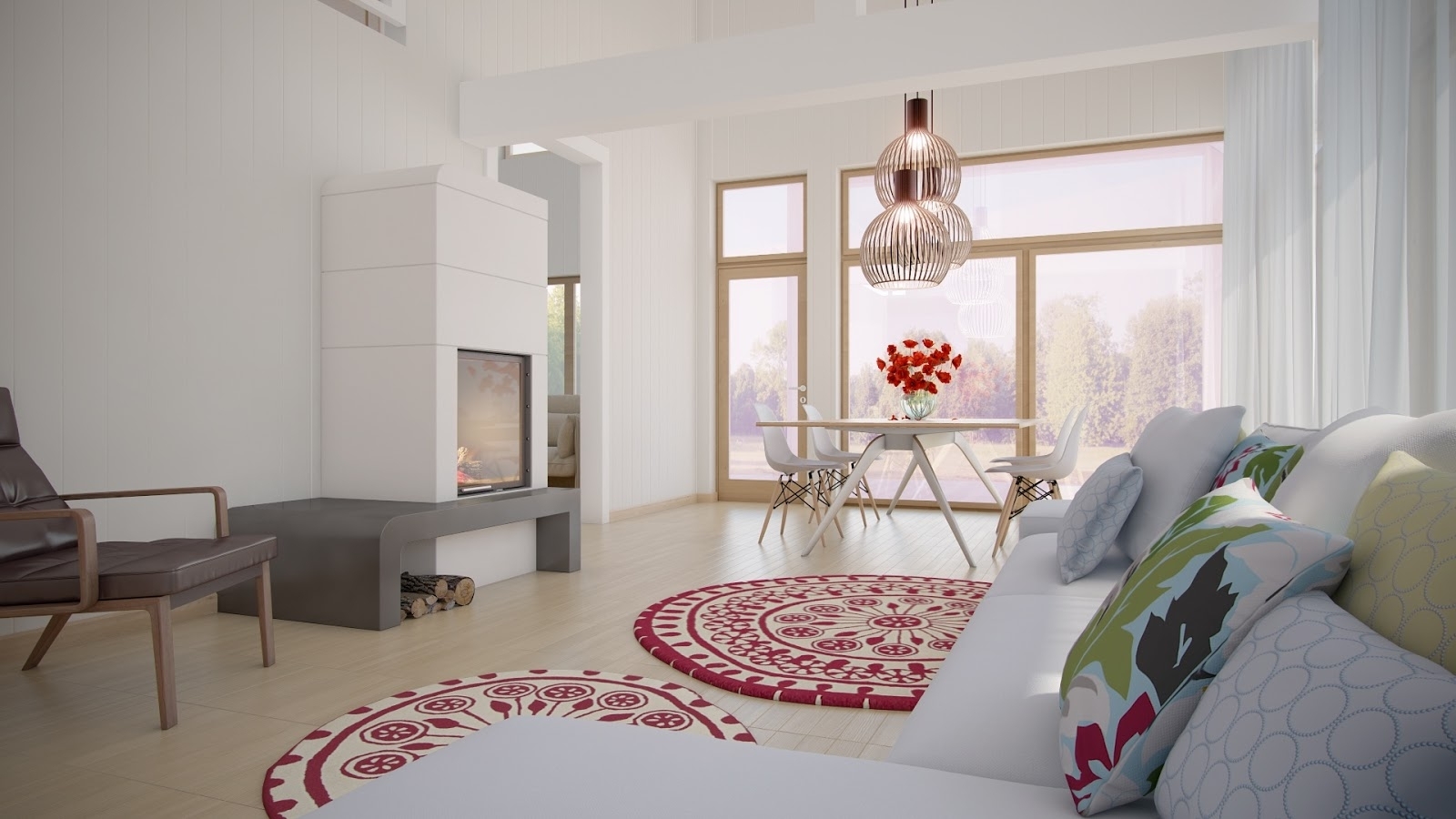 A sala de estar, criada tendo em conta o hygge, é aguçada por uma sensação de conforto, segurança, tranquilidade e satisfação. Muitas vezes é dominado por cores pastel, o que, no entanto, não impede o uso de tintas brilhantes.