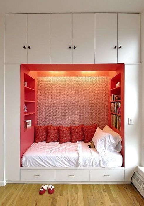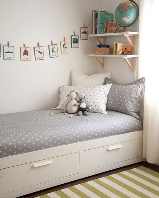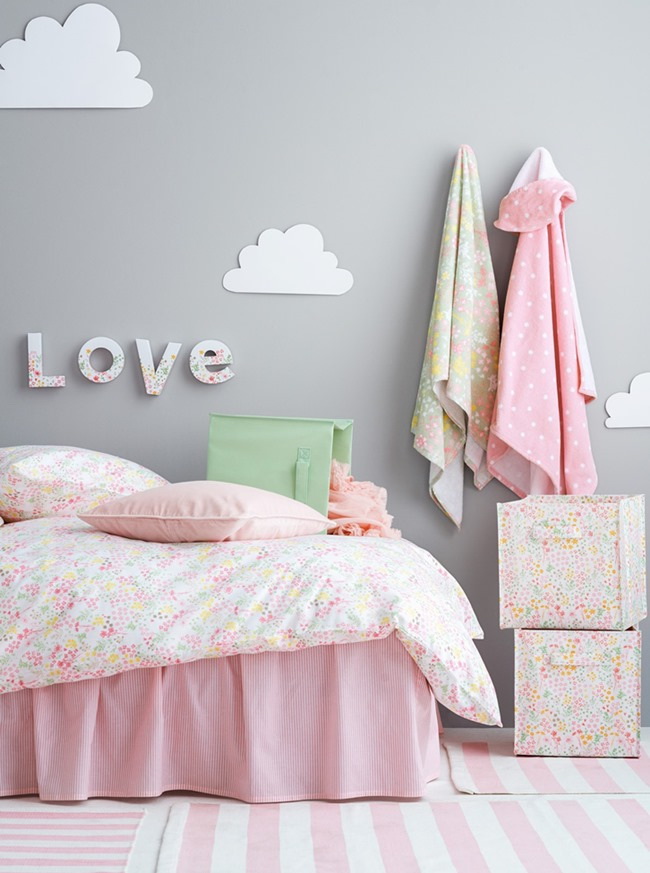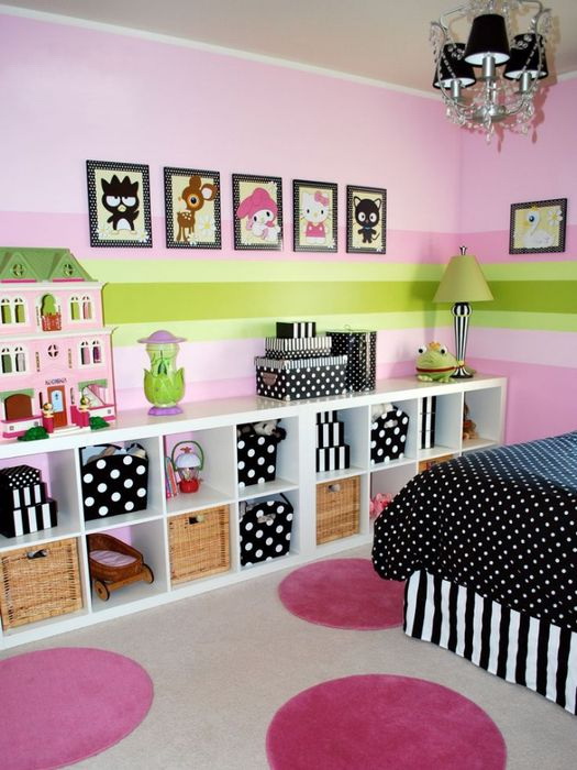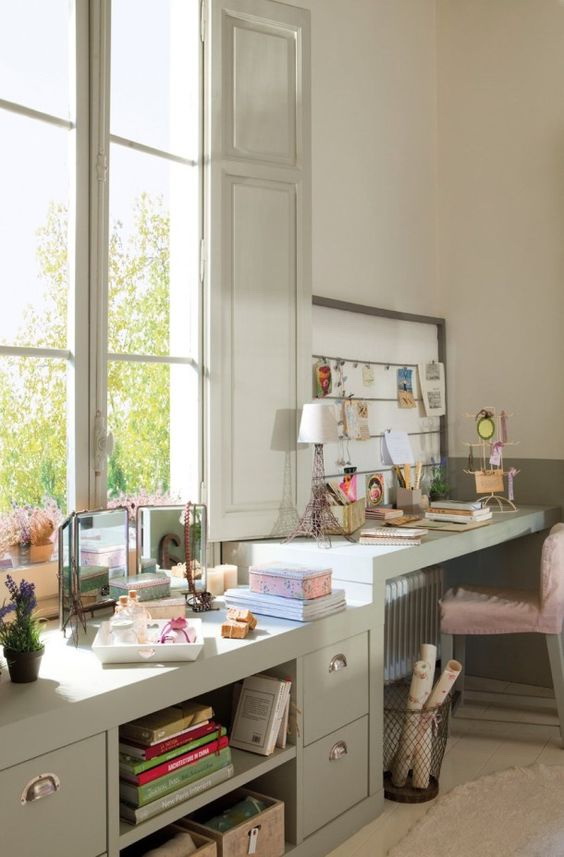 De acordo com a idade da menina, os locais para guardar brinquedos, livros e outras coisas devem estar localizados de modo que sejam fáceis de usar.