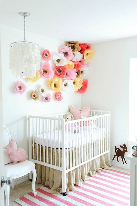 A cor rosa vai bem no berçário com branco, bege claro. Tornando-se uma referência, você pode complementar o interior com objetos com estampas florais.