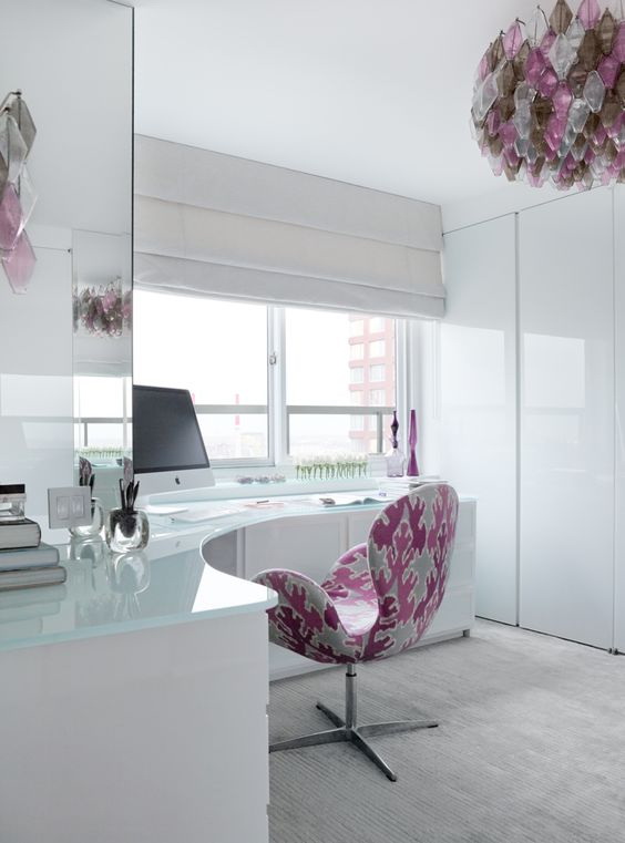 O branco é um pano de fundo universal para formas de realização criativas, soluções interiores. Em combinação com rosa, por exemplo, adquire maciez e maciez de marshmallow.