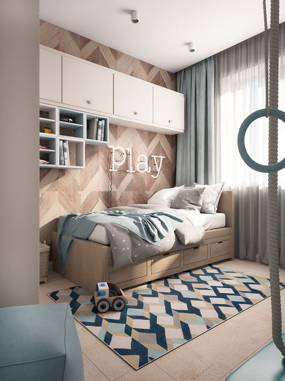 Hortelã, tons de azeitona são naturais. Eles são bem combinados com cores pastel, criando um interior agradável para a criança.
