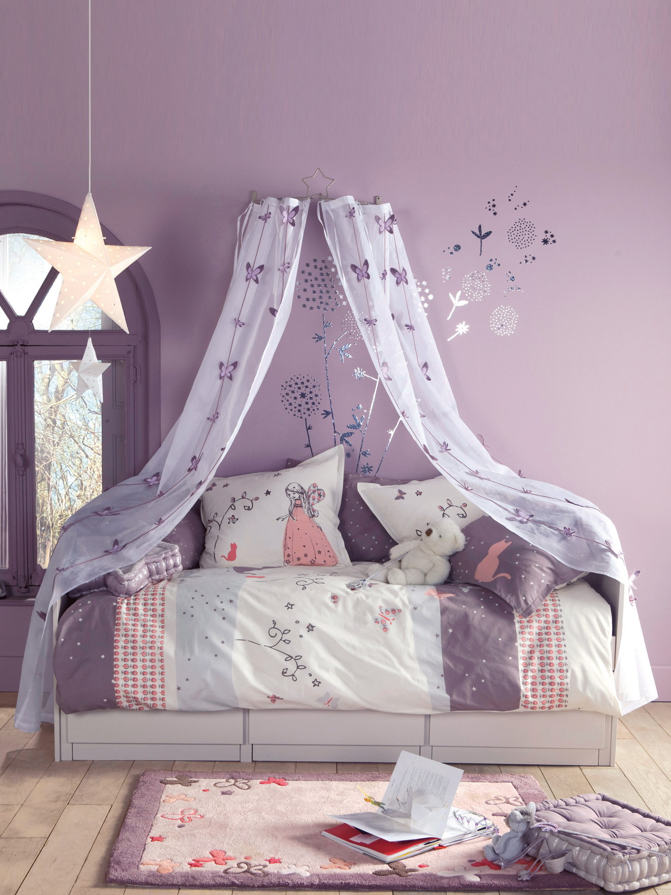 Para que o quarto fique macio, o lilás pode ser combinado com motivos florais, experimentando diferentes tonalidades da paleta.