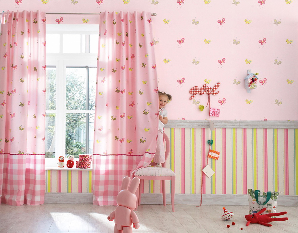 O esquema de cores é selecionado dependendo do design da sala. É melhor dar preferência ao papel de parede, já que o vinil, por toda a sua decoração, não é aconselhável usar no viveiro.