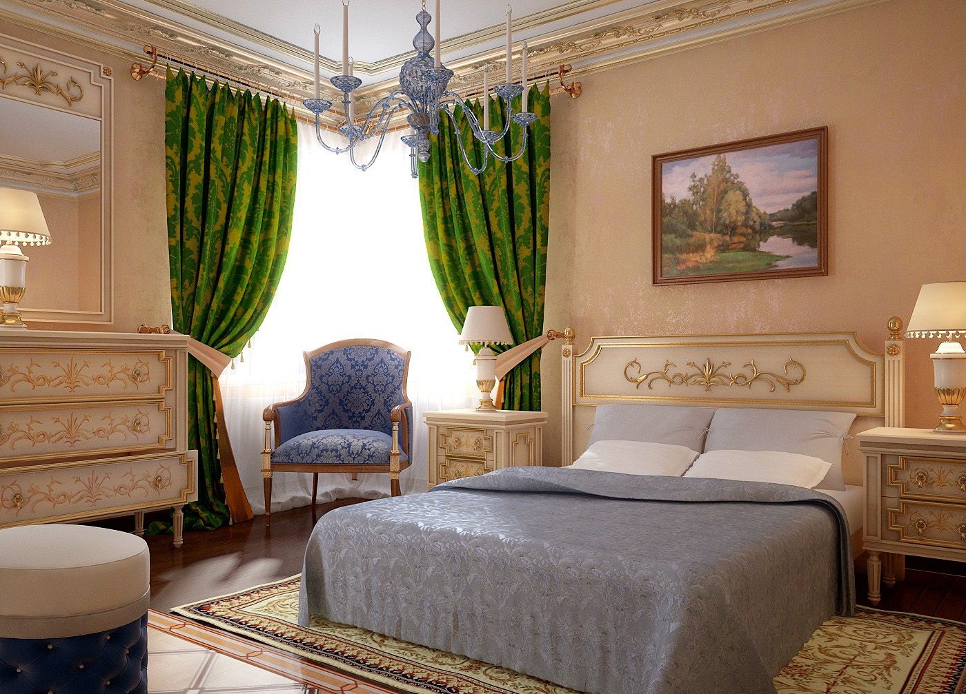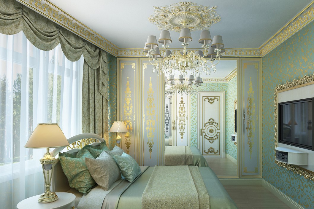 Quarto clássico é executado em cores brilhantes. Paredes, tetos, e suas outras superfícies são decoradas com uma bela decoração. Para design de interiores é usado caro mobília com formas geométricas regulares.