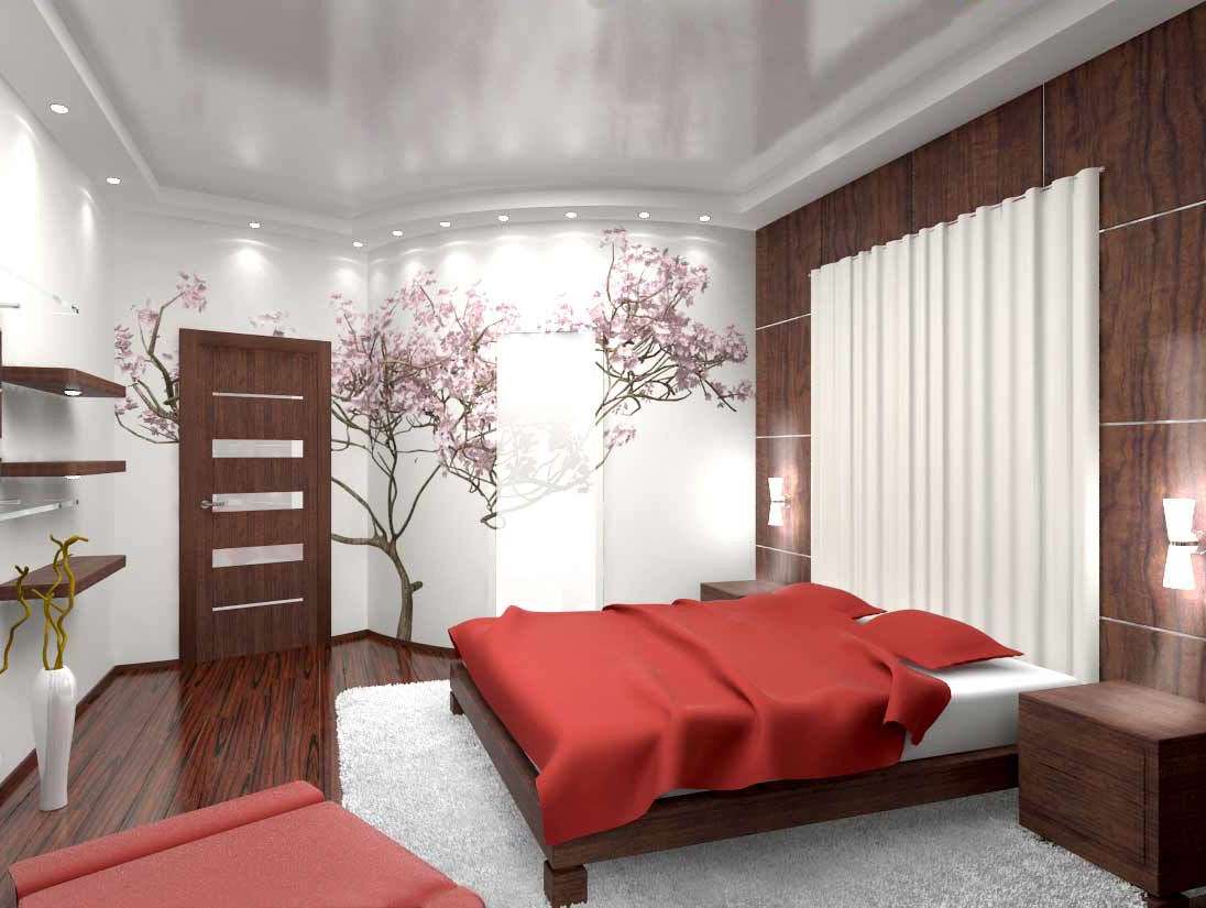 Assim, no quarto, muitas vezes colocam-se camas baixas no pódio, ao passo que é importante que, assim como outras peças de mobília funcional, se fundam em cores com as paredes. Escolhendo móveis não volumosos, mas de aparência clara, sem entalhes e padrões.