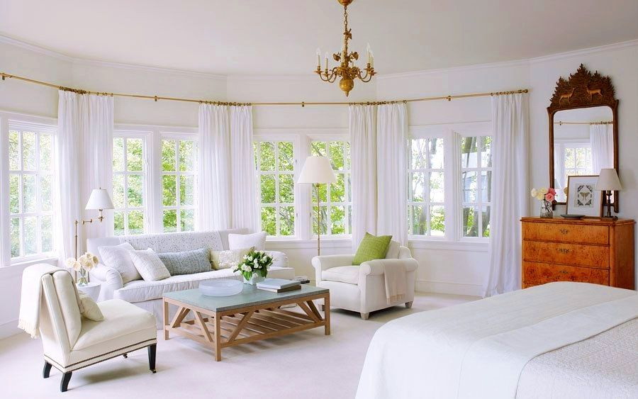 Cortinas, cortinas ou cortinas devem ser combinadas com véu na cama e outros itens na sala, mas não se fundem com eles.