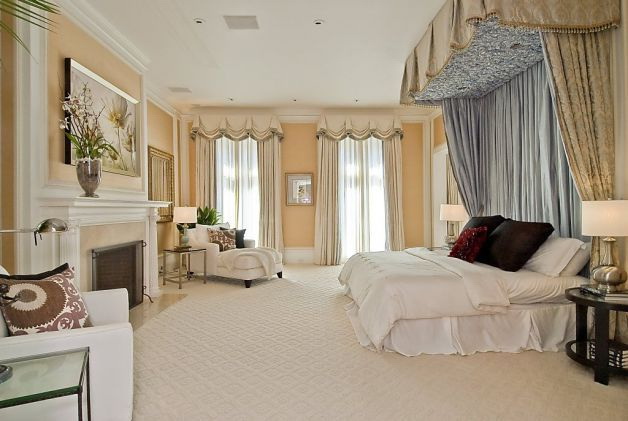 Se você não quiser colocar uma cama com dossel no seu quarto, pode enfatizar o estilo com belas cortinas pesadas de tecido. Essa solução é boa para organizar um quarto de tamanho médio.