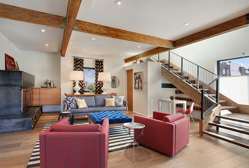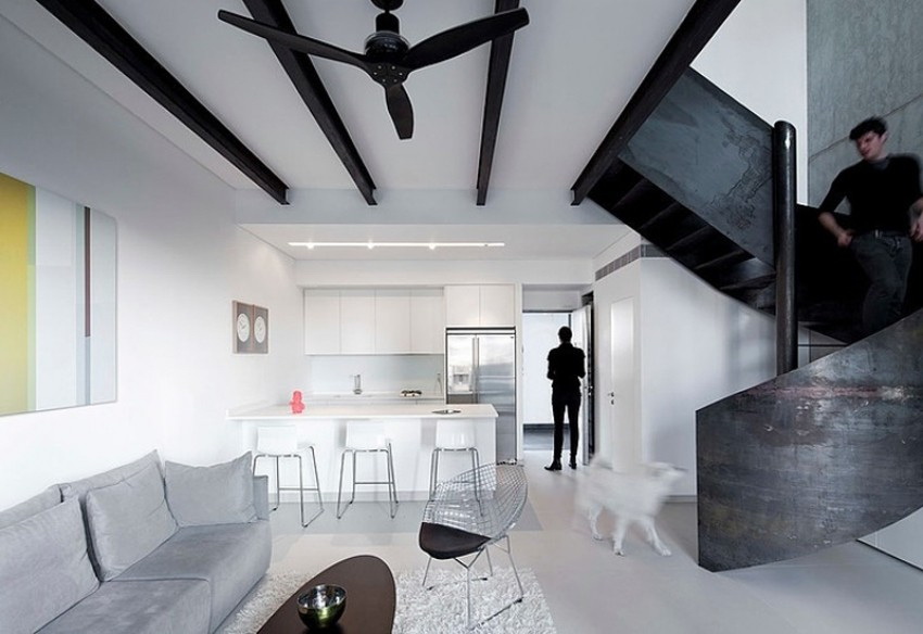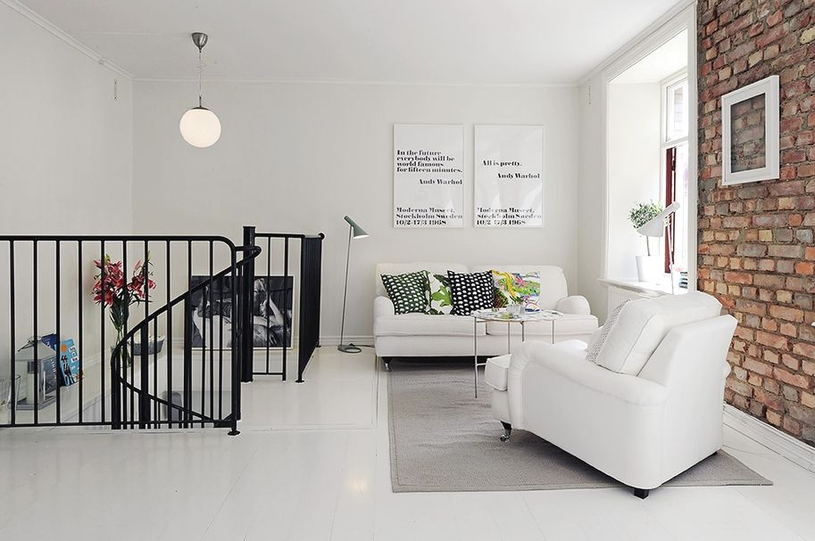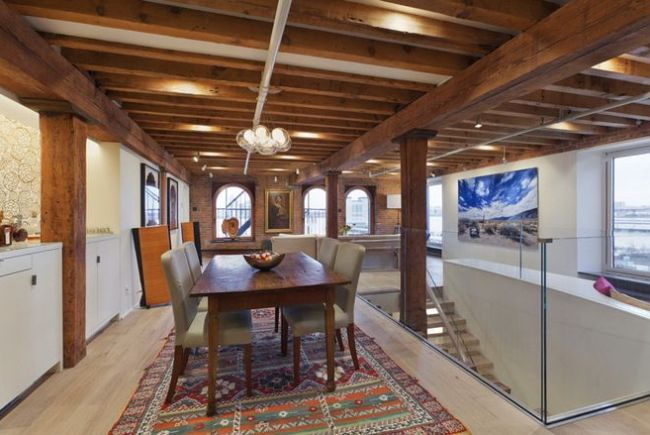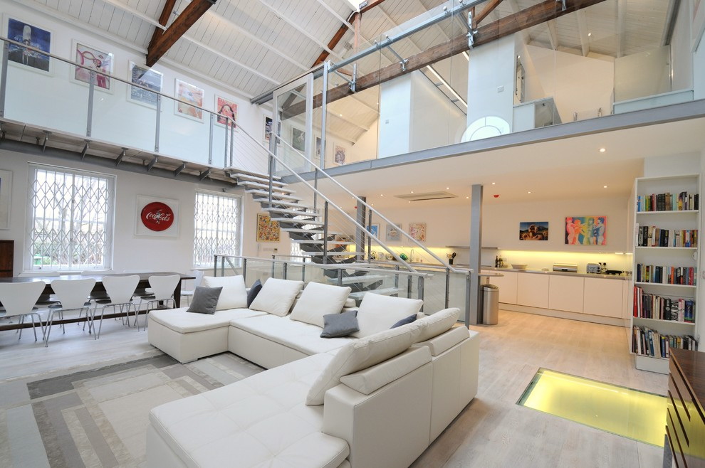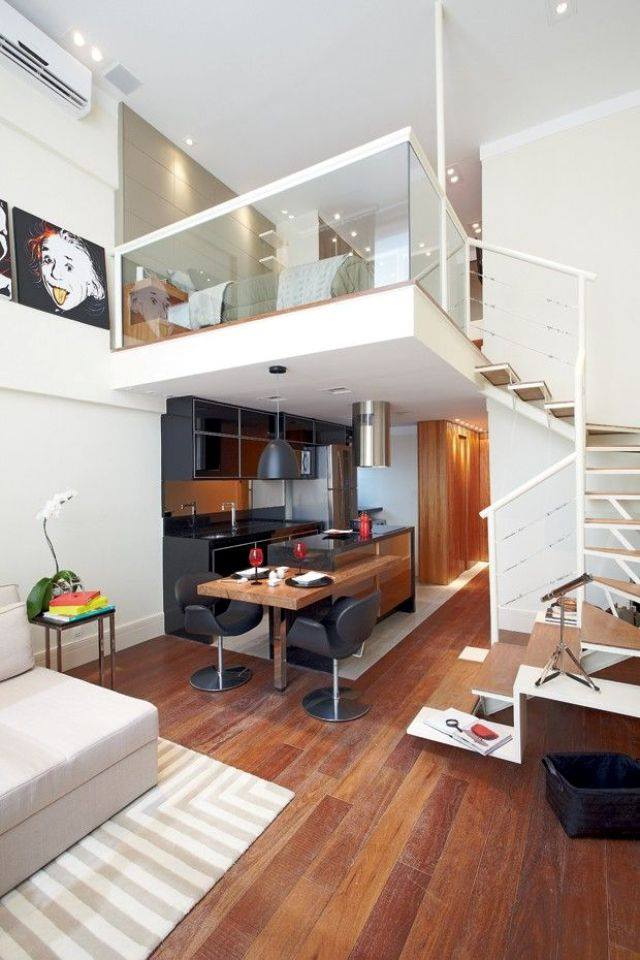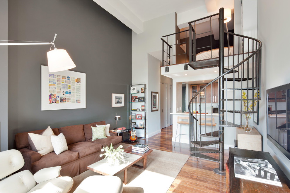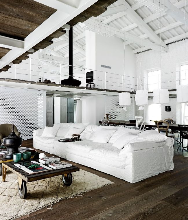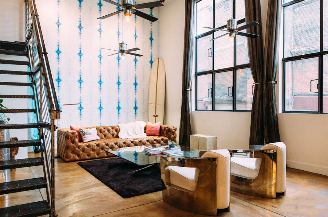 - Loft. Vindo da América, este estilo é ideal para grandes quartos com tectos altos. Suas cores são brancas pretocor de tijolo e cor de concreto. As paredes são cobertas com alvenaria e parcialmente rebocadas, o teto também é estucado e fazendo vigas nele. O chão é cortado sob o concreto. Móveis no sotão deve ser escritório, feito de metal e couro, obrigatório na cozinha balcão de bar. Acessórios - relacionados aos hobbies dos proprietários. Graffiti obrigatório na parede.
