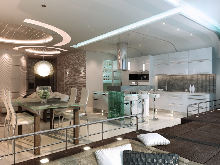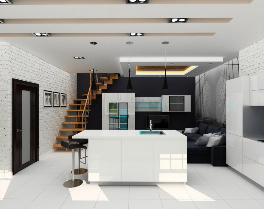 - Em camadas tecto. A solução não é apenas interessante, mas também muito bonita. Pode combinar drywall e teto suspenso, ou gesso e drywall. Podem ser formas diferentes, de cores diferentes. Geralmente é feito acima de uma zona, acima da outra. Combine em iluminação diferente.