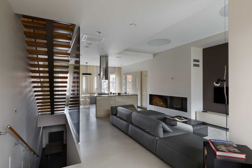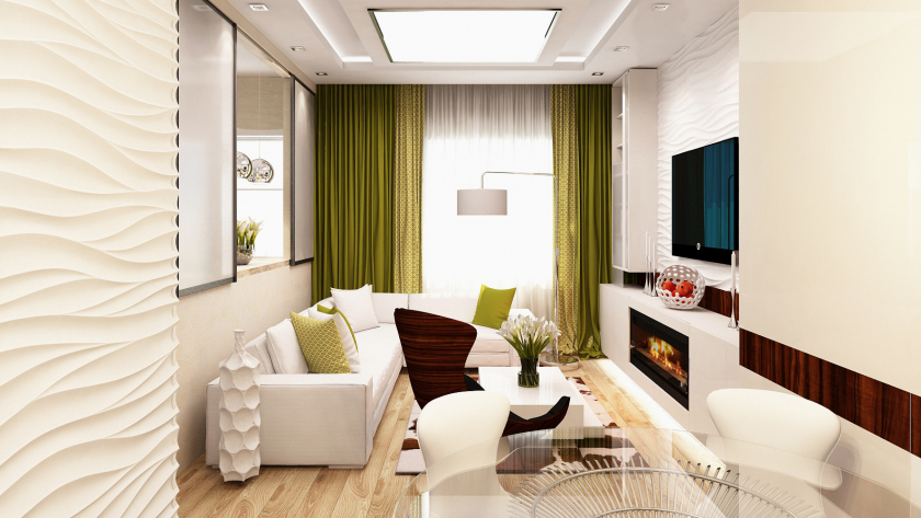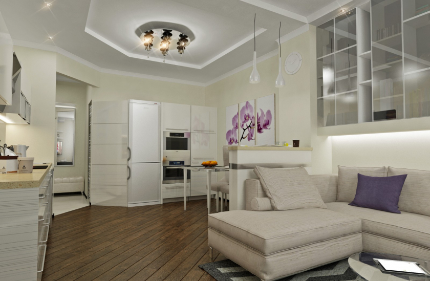 - Parcial zoneamento. Cozinha separada, sala de estar separada que conecta alta arco ou de qualquer outra maneira que deixe a vista aberta mais do que as folhas comuns da porta. Uma boa solução para alguns estilos que exigem espaço - por exemplo, para Escandinavo ou minimalismo.