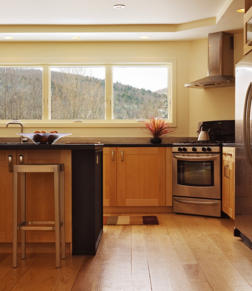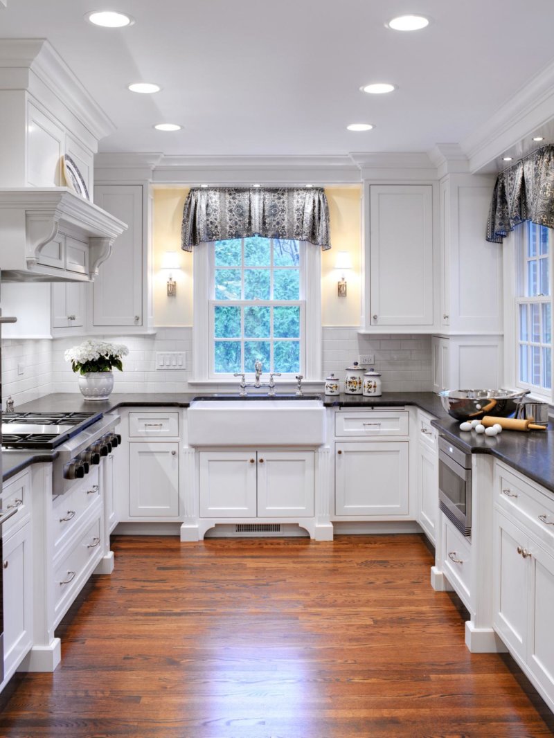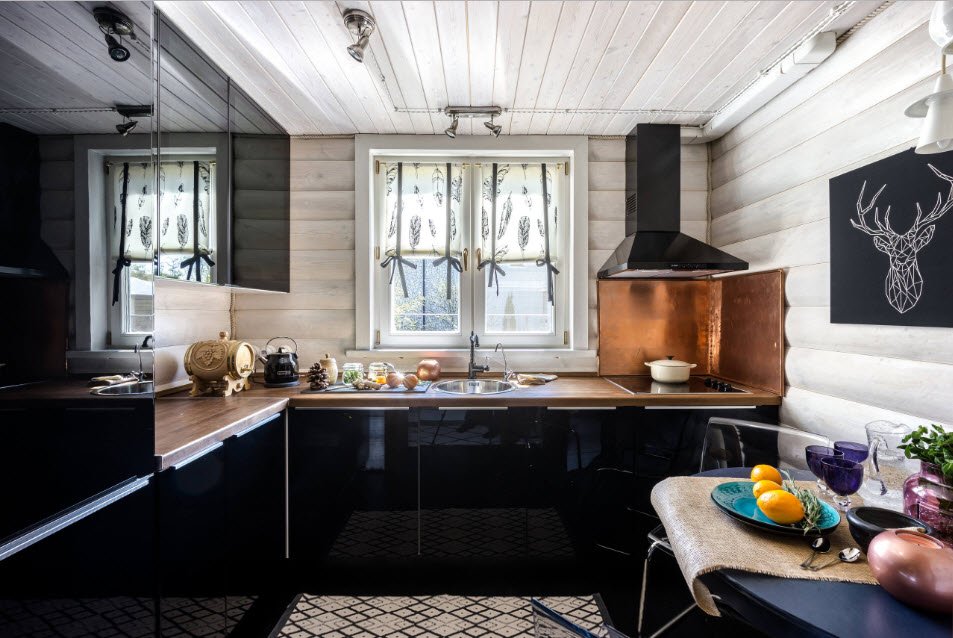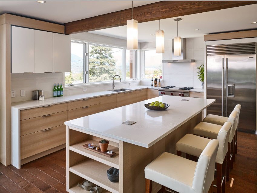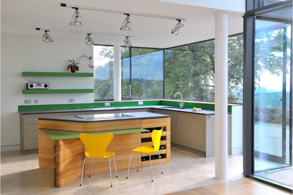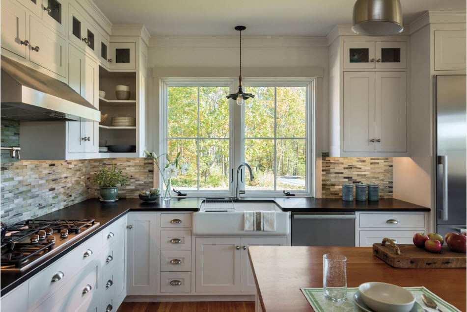 Colocar a unidade da cozinha ao longo da parede com janelas permite reduzir os custos de energia. Cozinhando confortavelmente em luz natural. Mas, na maioria das cozinhas modernas, uma bateria é colocada sob a janela.