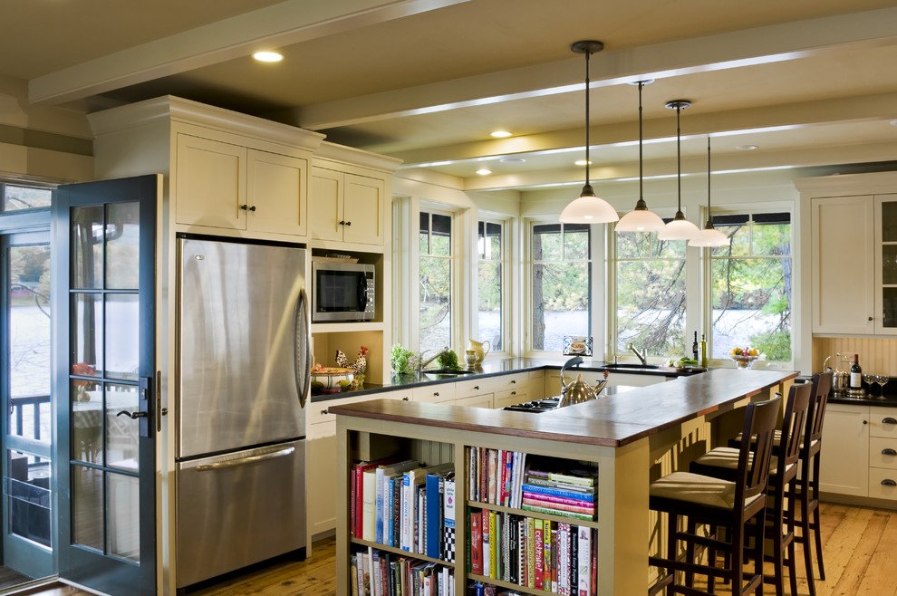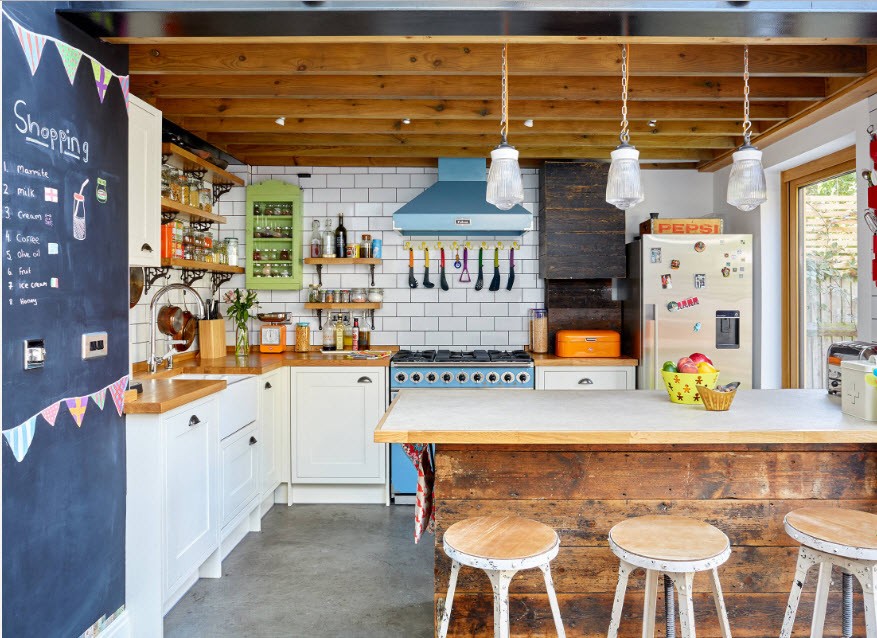 Associação com balcão de bar ajuda a fazer sem uma mesa de jantar. Esta é uma opção ideal para famílias que passam menos tempo na cozinha.