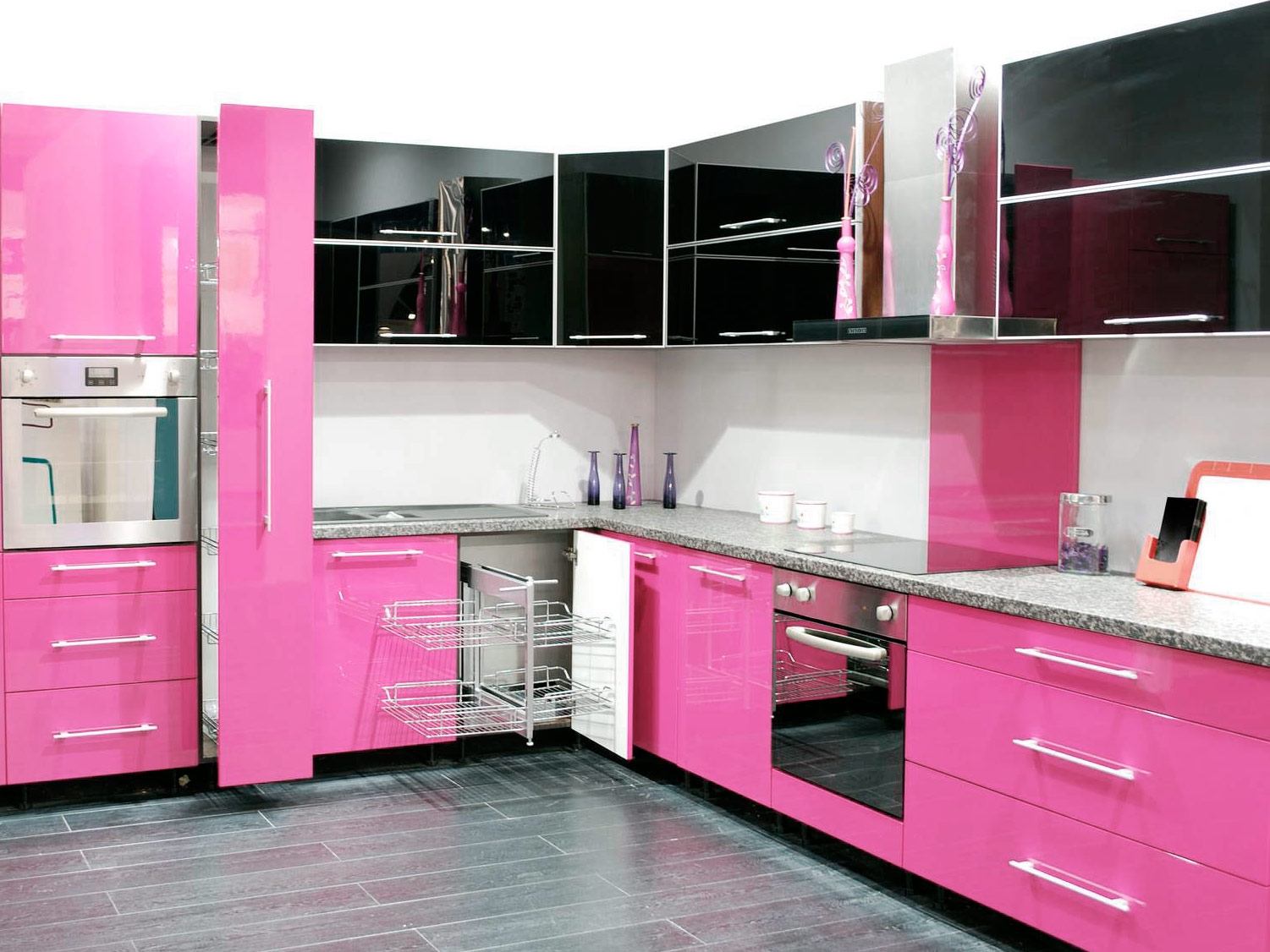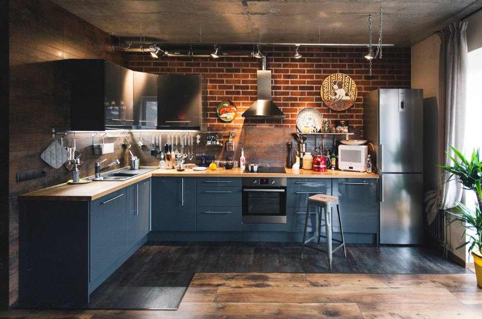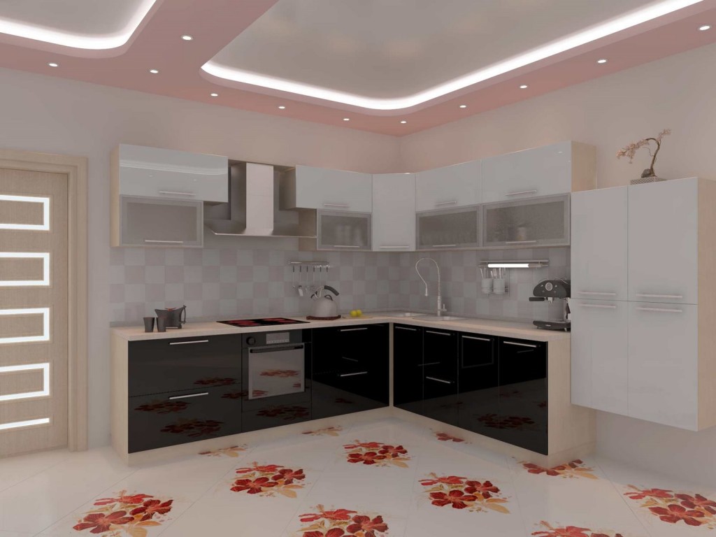 Tais cozinhas são difíceis de comprar na forma terminada. Precisa de um projeto individual. O tempo é perdido para fazer um pedido e os montadores de móveis são necessários para a instalação. As gavetas no estado aberto dificultam a abertura das portas laterais. Se a pia estiver localizada no canto, é difícil usar o espaço abaixo dela. Estas são pequenas falhas na versão em forma de L. Eles são resolvidos se você solicitar um projeto de um designer competente.