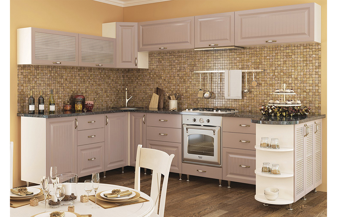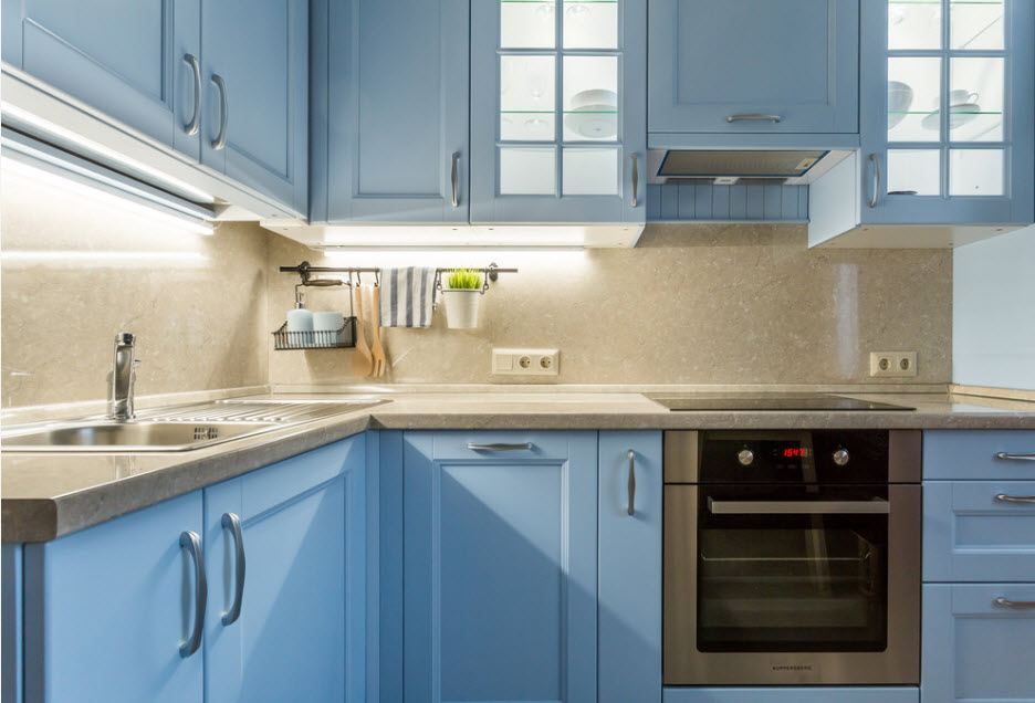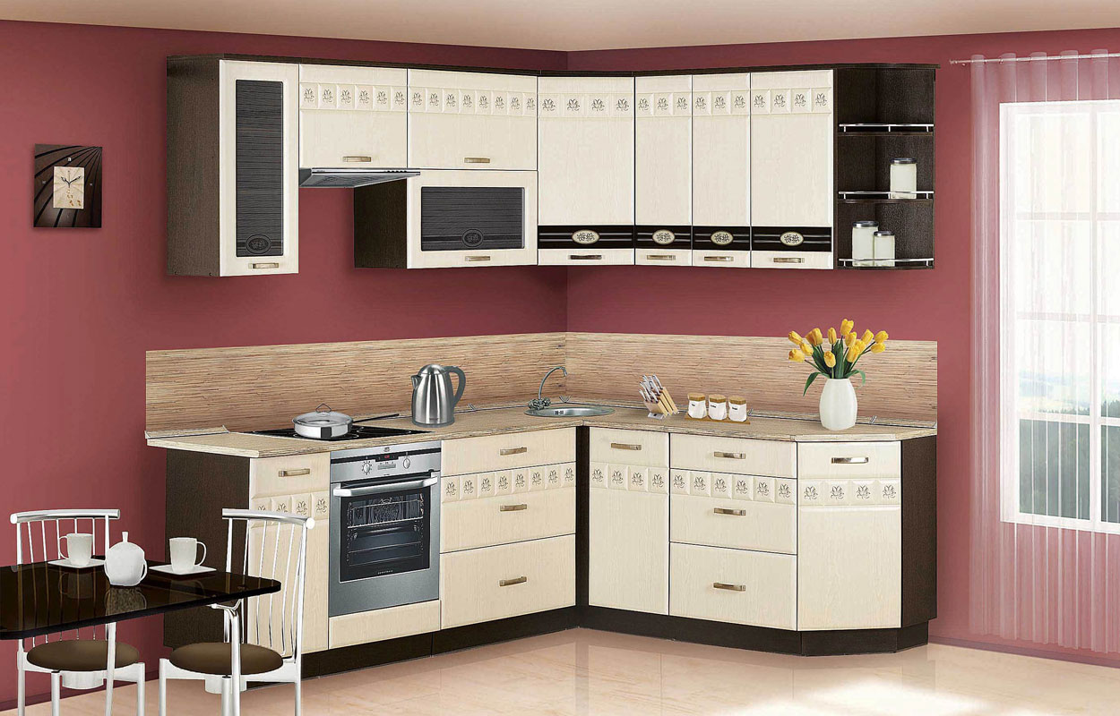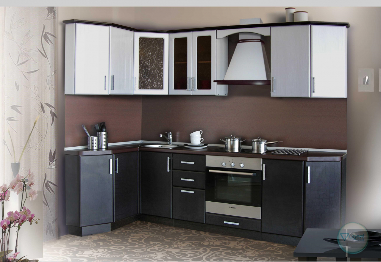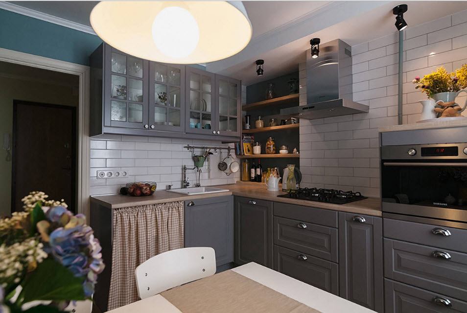 O espaço limitado requer um planejamento cuidadoso dos móveis. A forma em L permite que você instale mesas e armários mais espaçosos. Todos os utensílios necessários serão escondidos, e na ordem perfeita da cozinha. Este conjunto é mais barato porque os fabricantes vinculam o preço à filmagem das mesas e prateleiras.