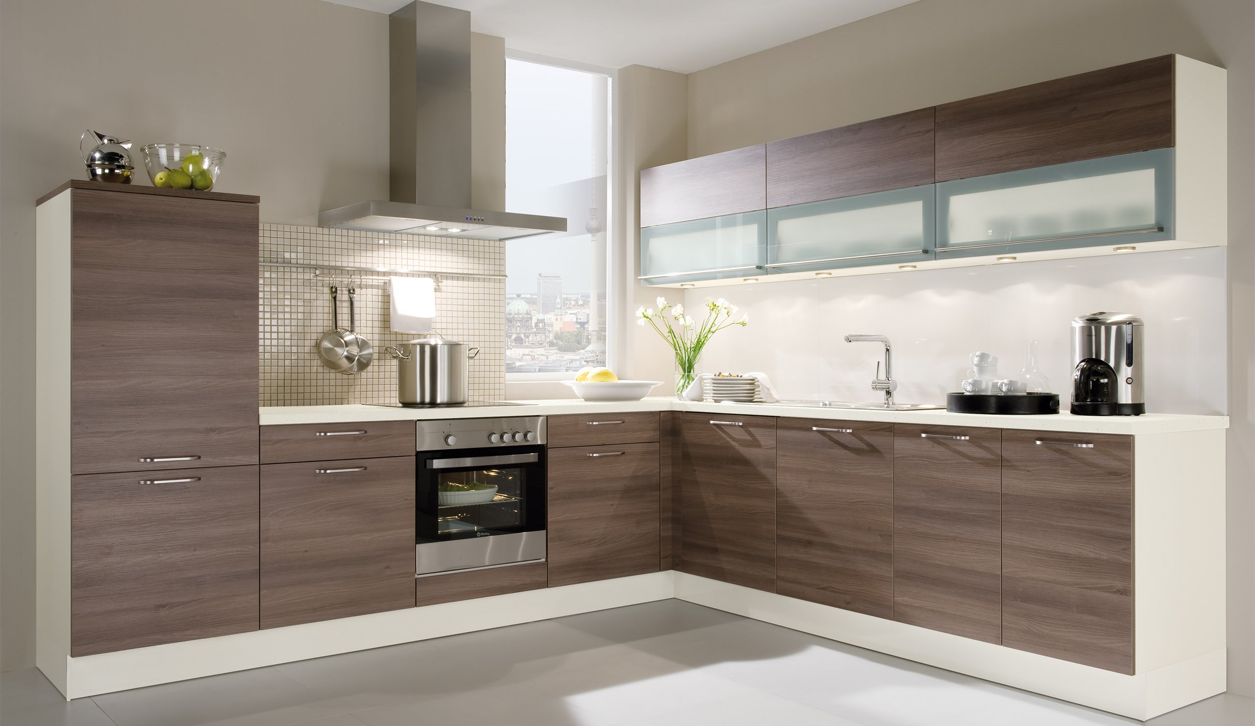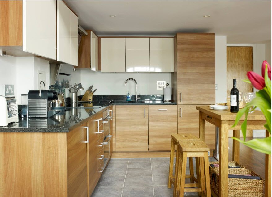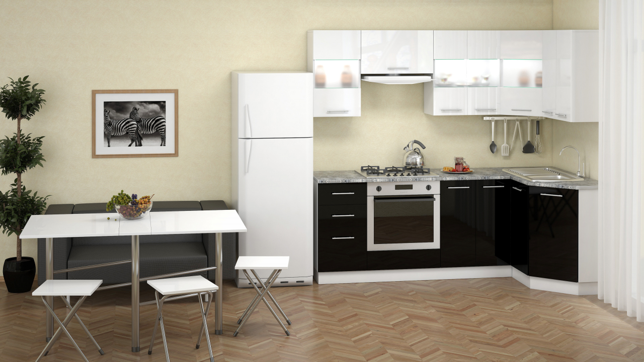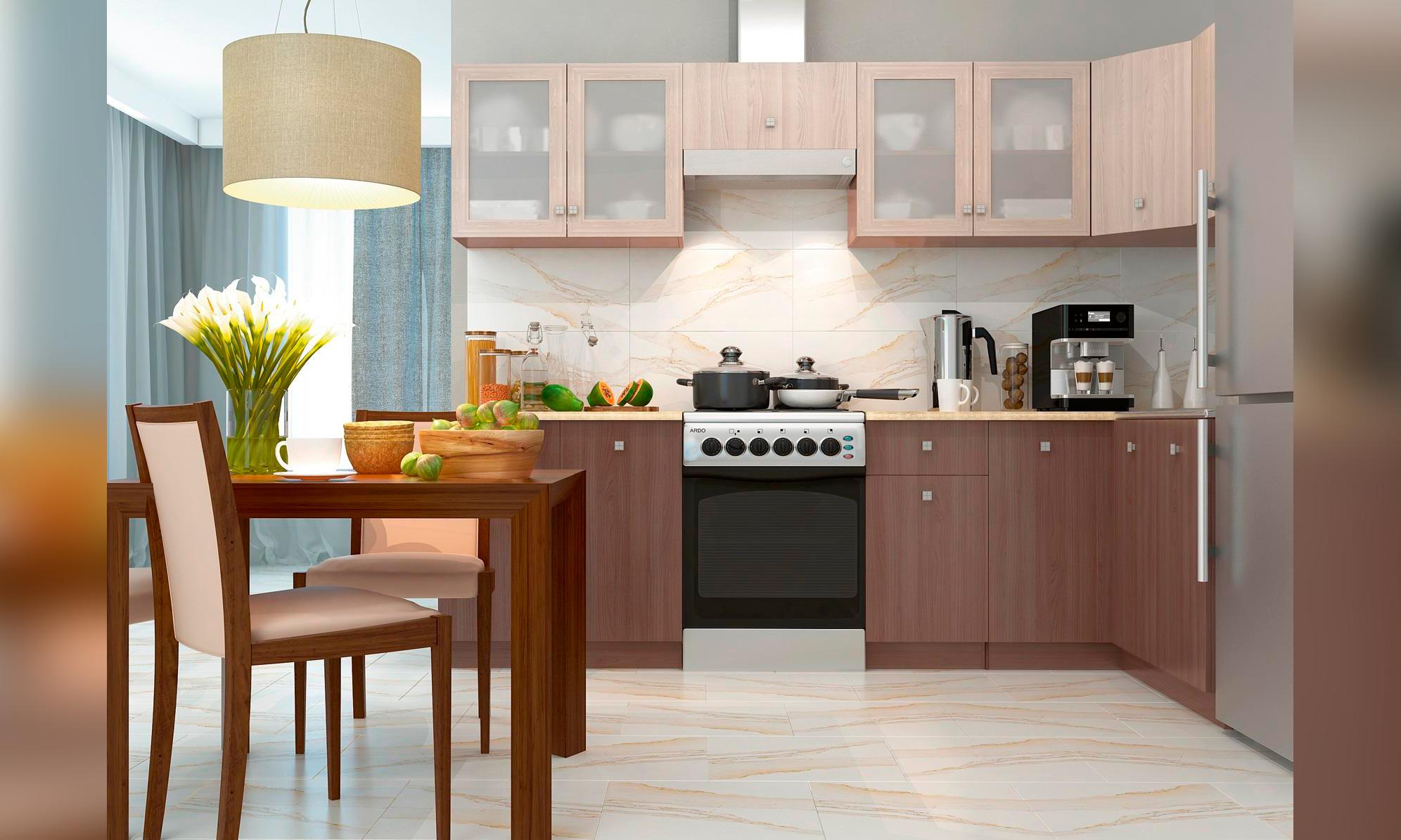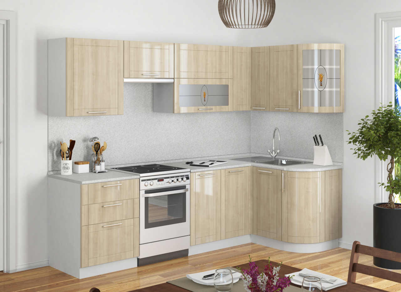 O espaço limitado requer um planejamento cuidadoso dos móveis. A forma em L permite que você instale mesas e armários mais espaçosos. Todos os utensílios necessários serão escondidos, e na ordem perfeita da cozinha. Este conjunto é mais barato porque os fabricantes vinculam o preço à filmagem das mesas e prateleiras.