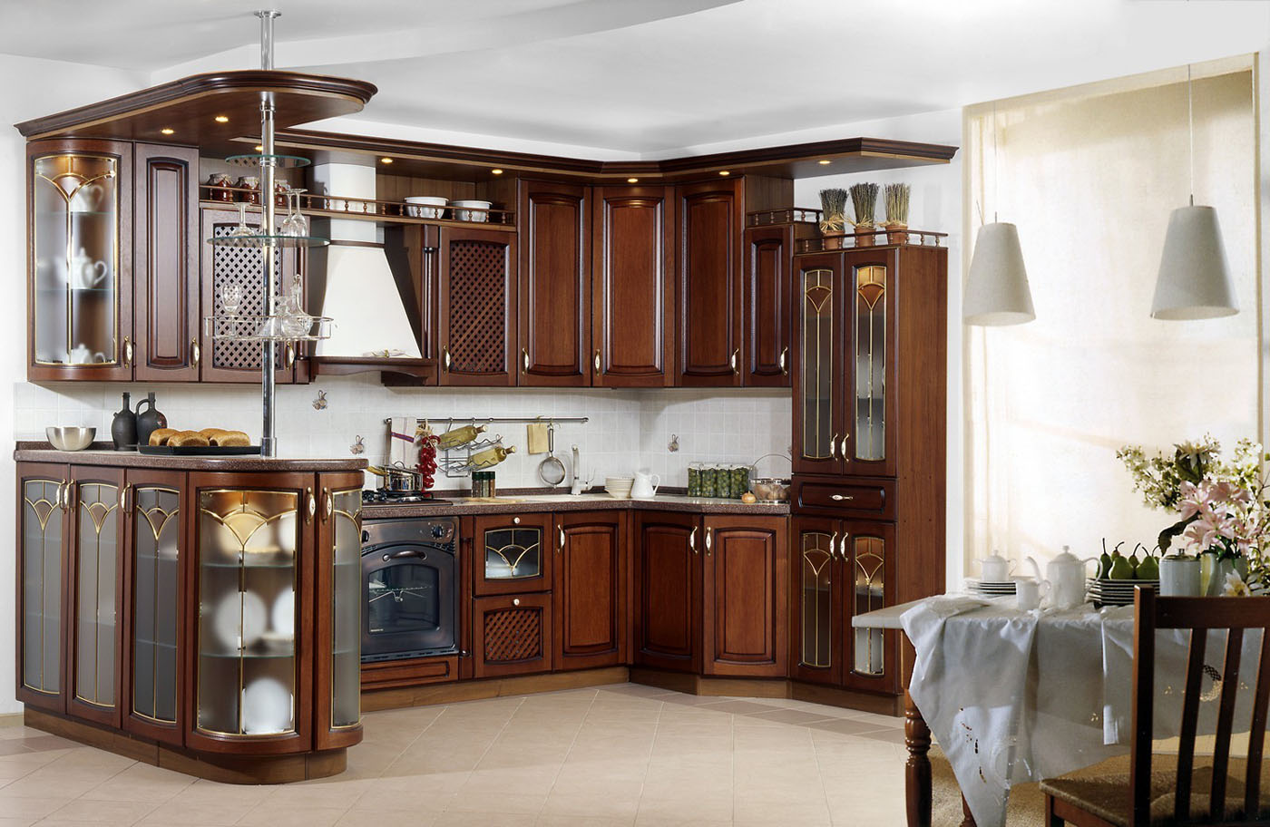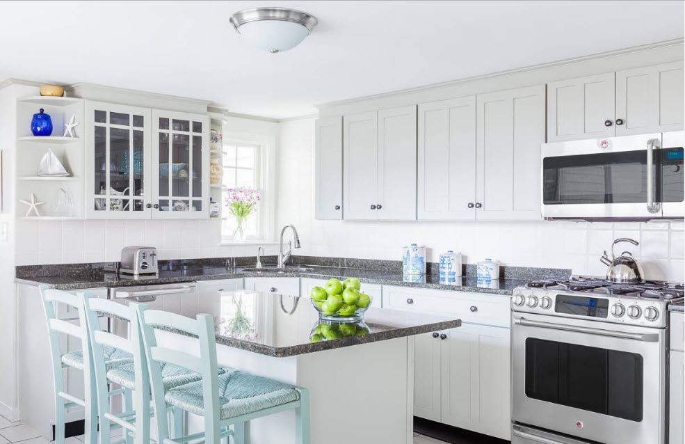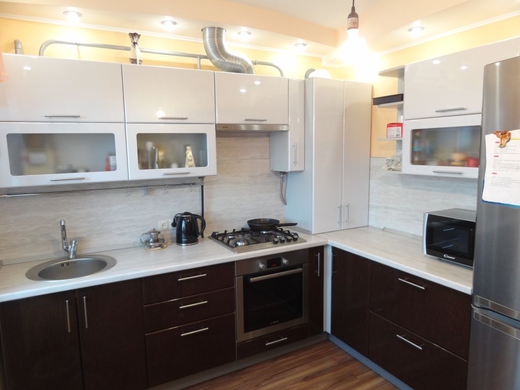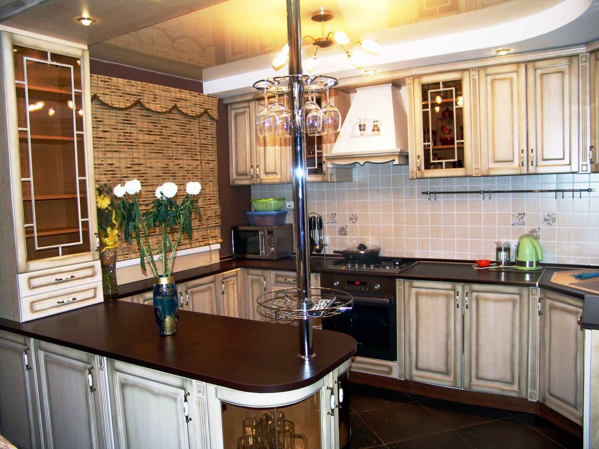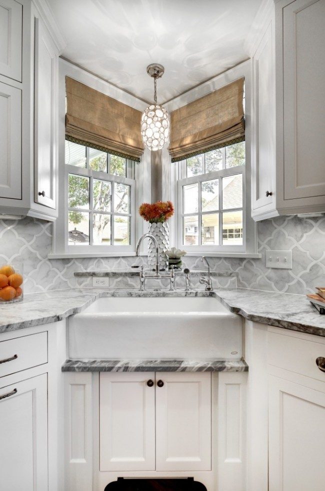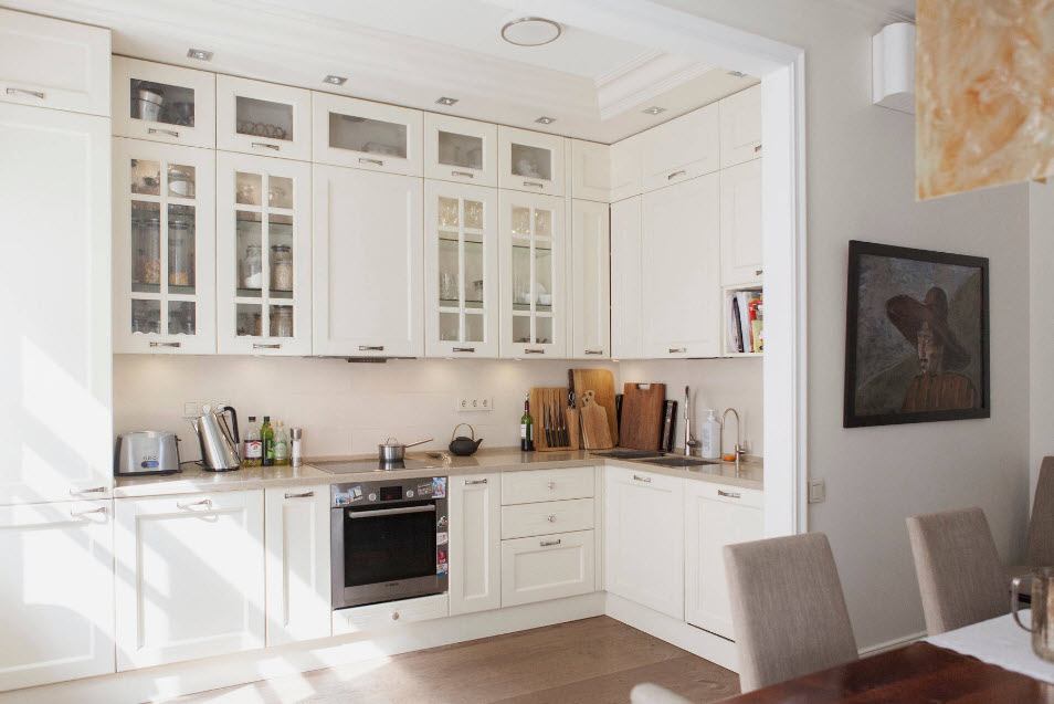 Para resumir: móveis de cozinha de canto - uma opção para uma cozinha de diferentes tamanhos. Isso ajuda a determinar o limite entre a área de trabalho e o grupo de jantar. Isso torna os quartos compactos.