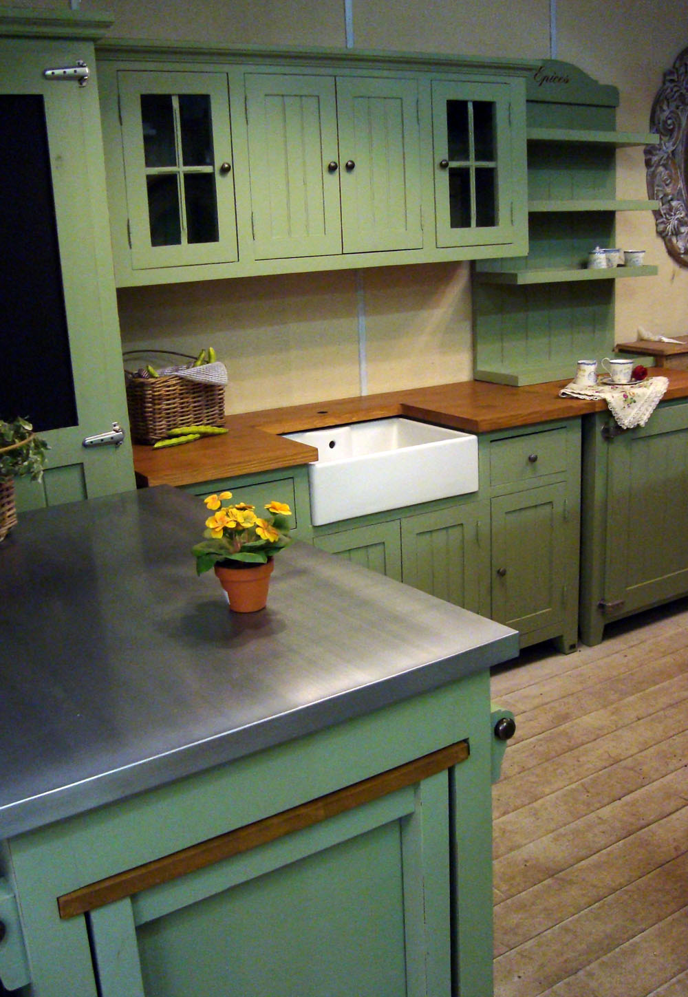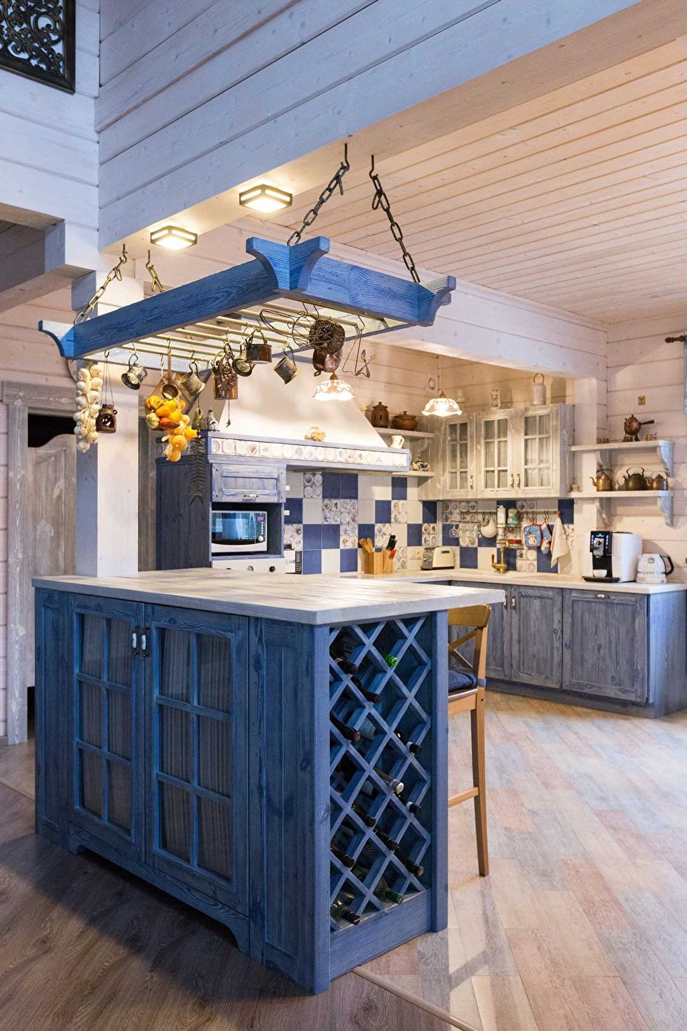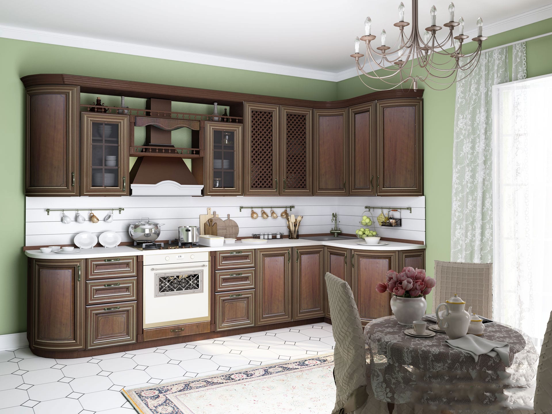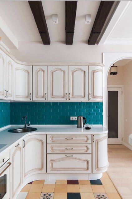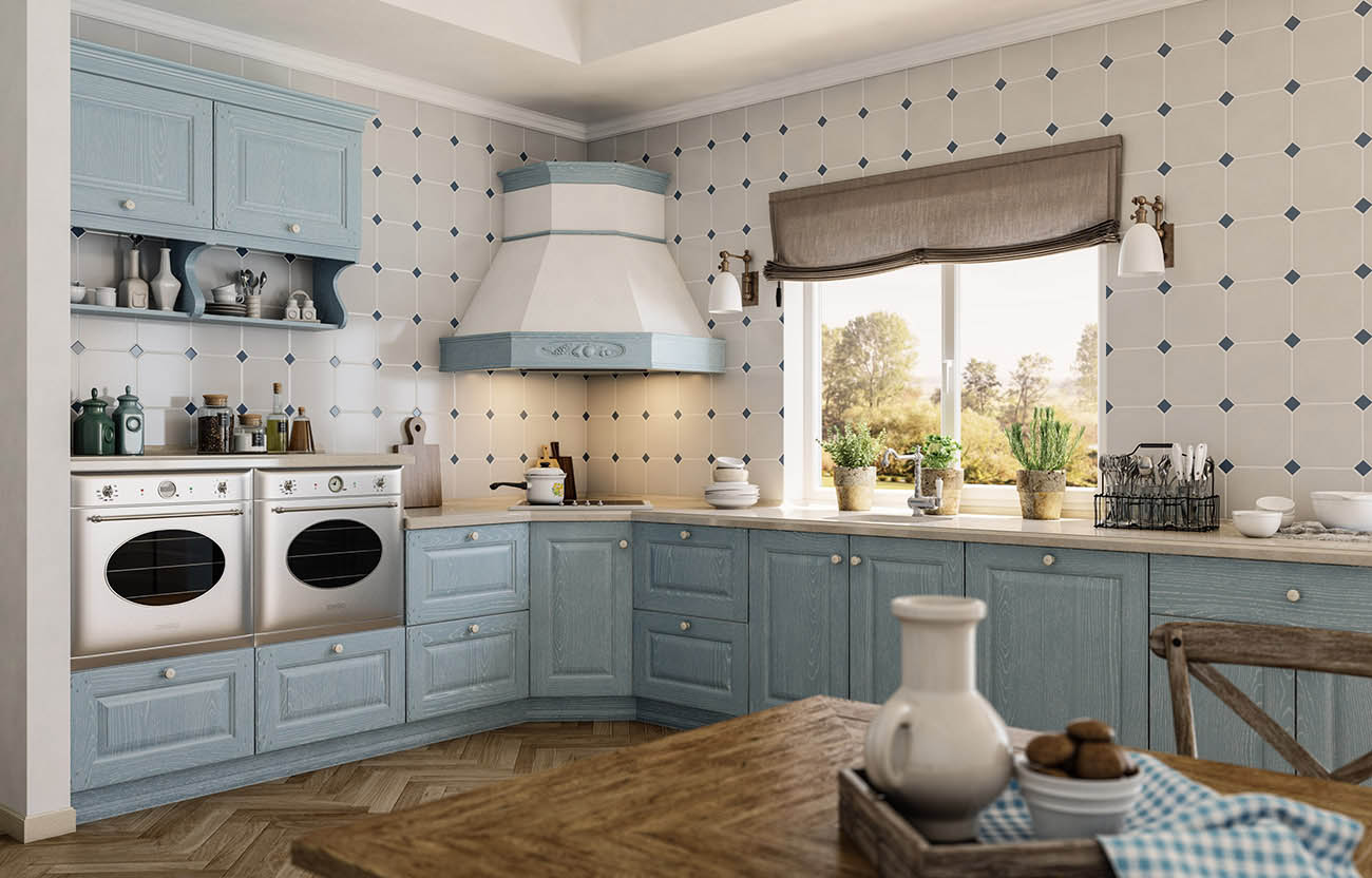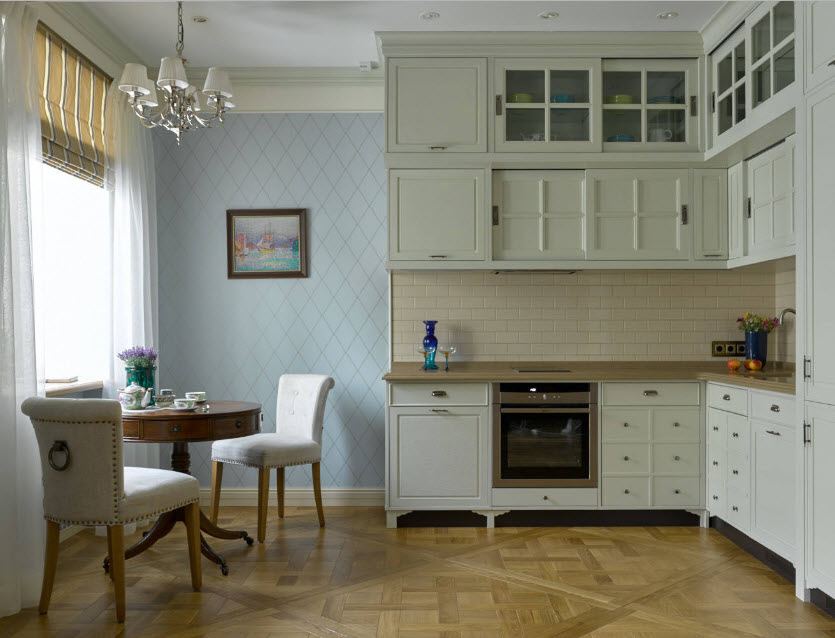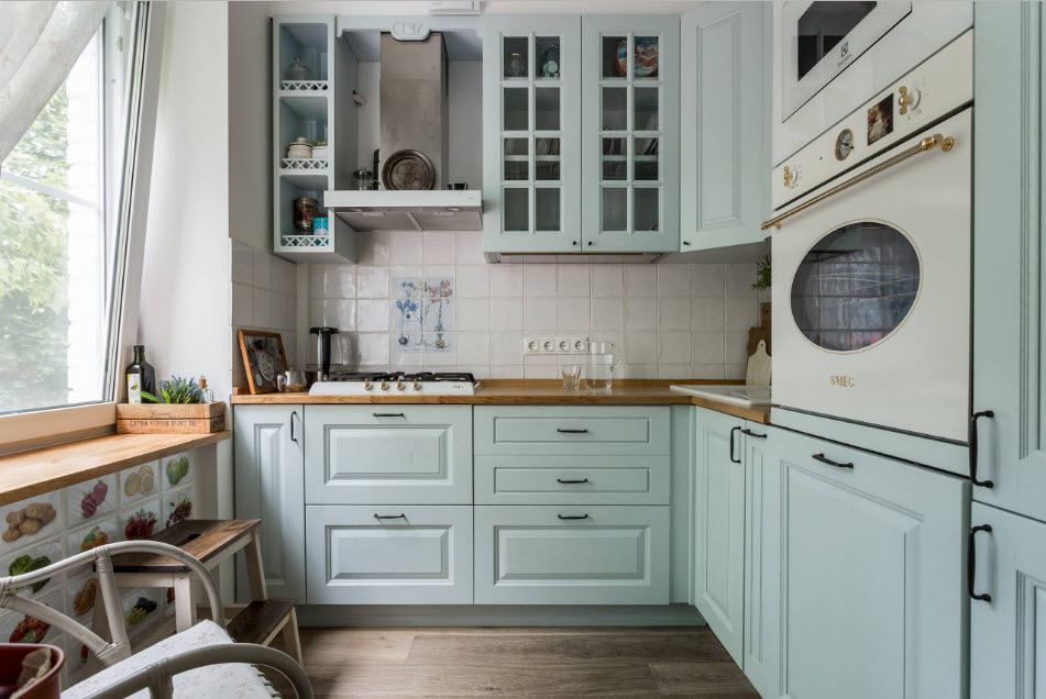 Provença estilo fácil. Móveis leves, elementos esculpidos, detalhes em madeira. Gama de cores: todas as tonalidades de cores claras: verde, azul, bege, leite assado, castanho.