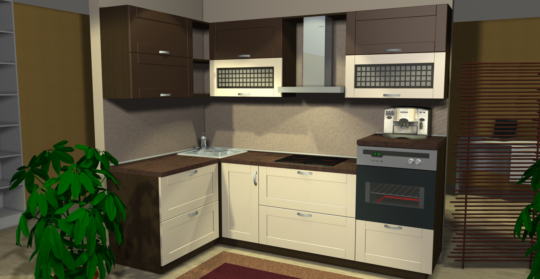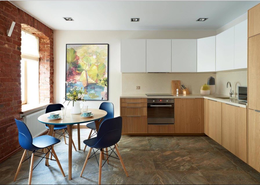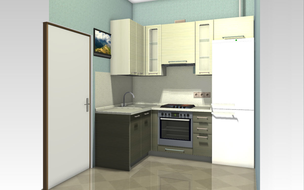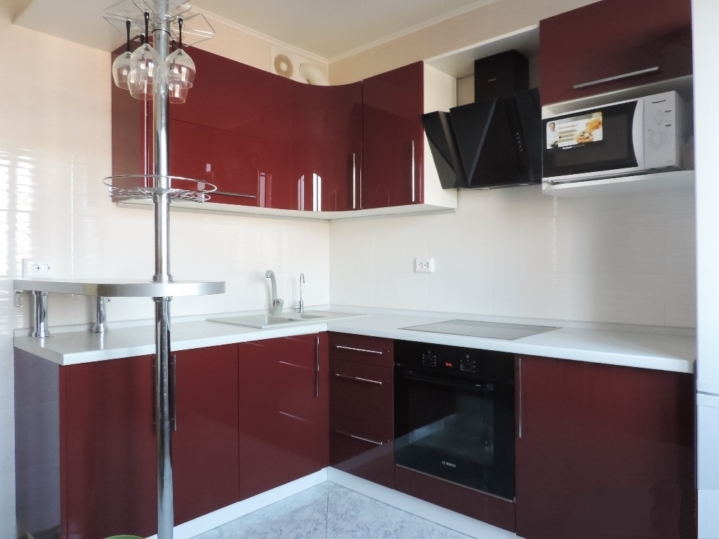Em salas pequenas, a colocação angular ideal de móveis. Neste caso, é mais fácil instalar equipamentos, utensílios de cozinha e organizar locais de armazenamento para pratos e utensílios de cozinha.