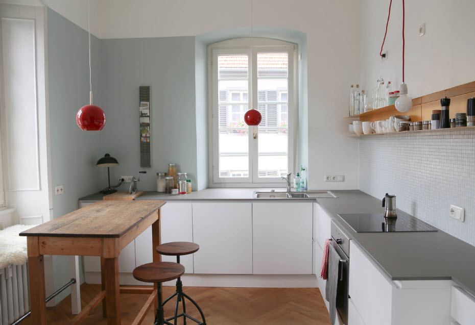 Organização incomum do espaço: a versão angular é usada para trabalhos preparatórios e para a preparação e lavagem de pratos definem o design da ilha.
